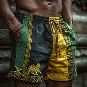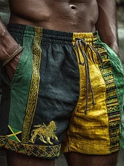Men's Reggae Lion & Jamaica Flag Embroidered Patchwork Linen Shorts