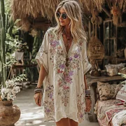 Women's Floral Embroidery Art V Neck Comfy Short Sleeve Midi Dress