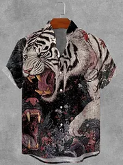 Men's Tiger Art Print Short Sleeve Linen Blend Shirt