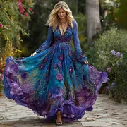 Women's Vintage Rose Floral Gradient Pattern V-neck Long-sleeved Dress