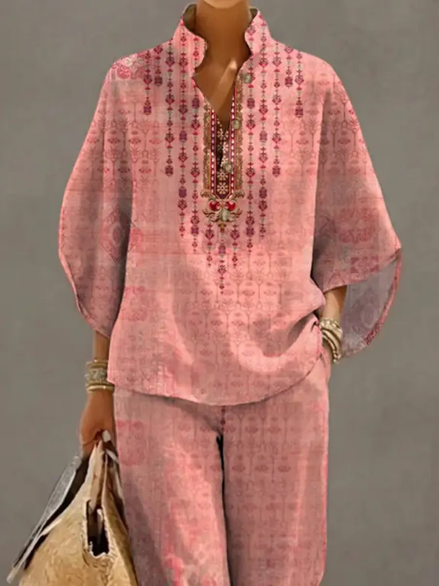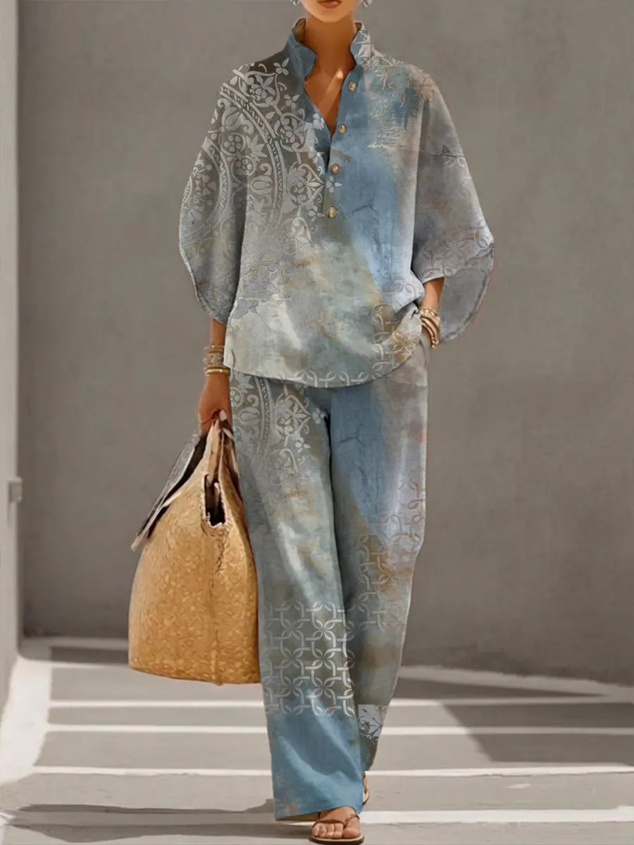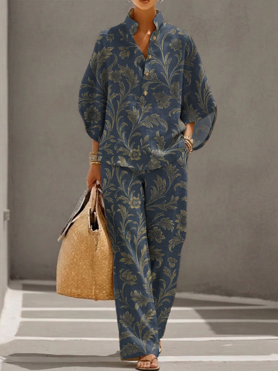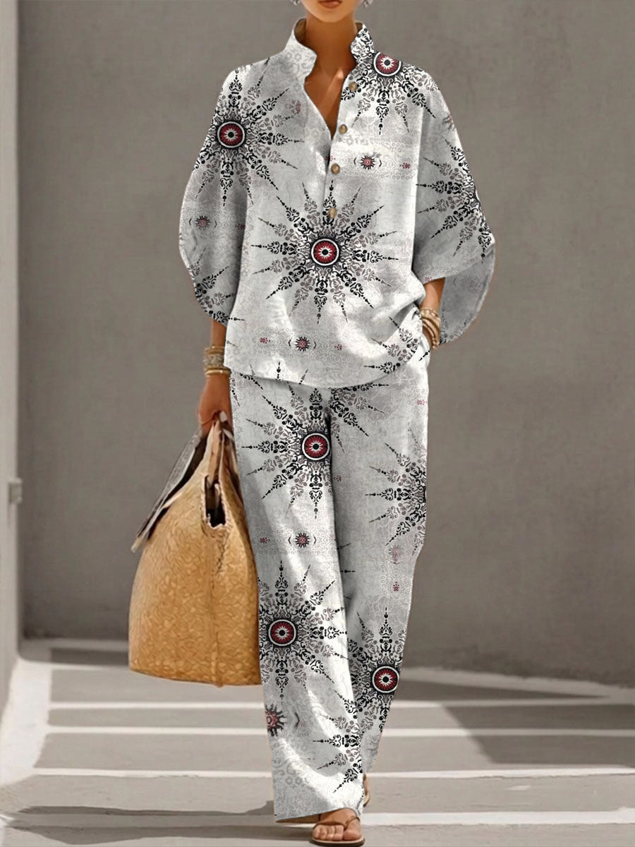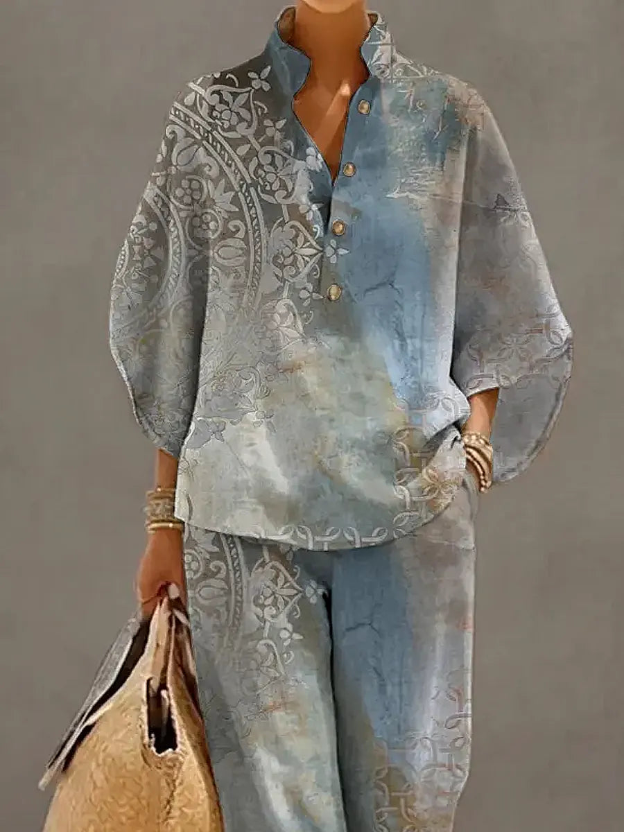 Women's Vintage Art Print Casual Cotton-linen Two-piece Set