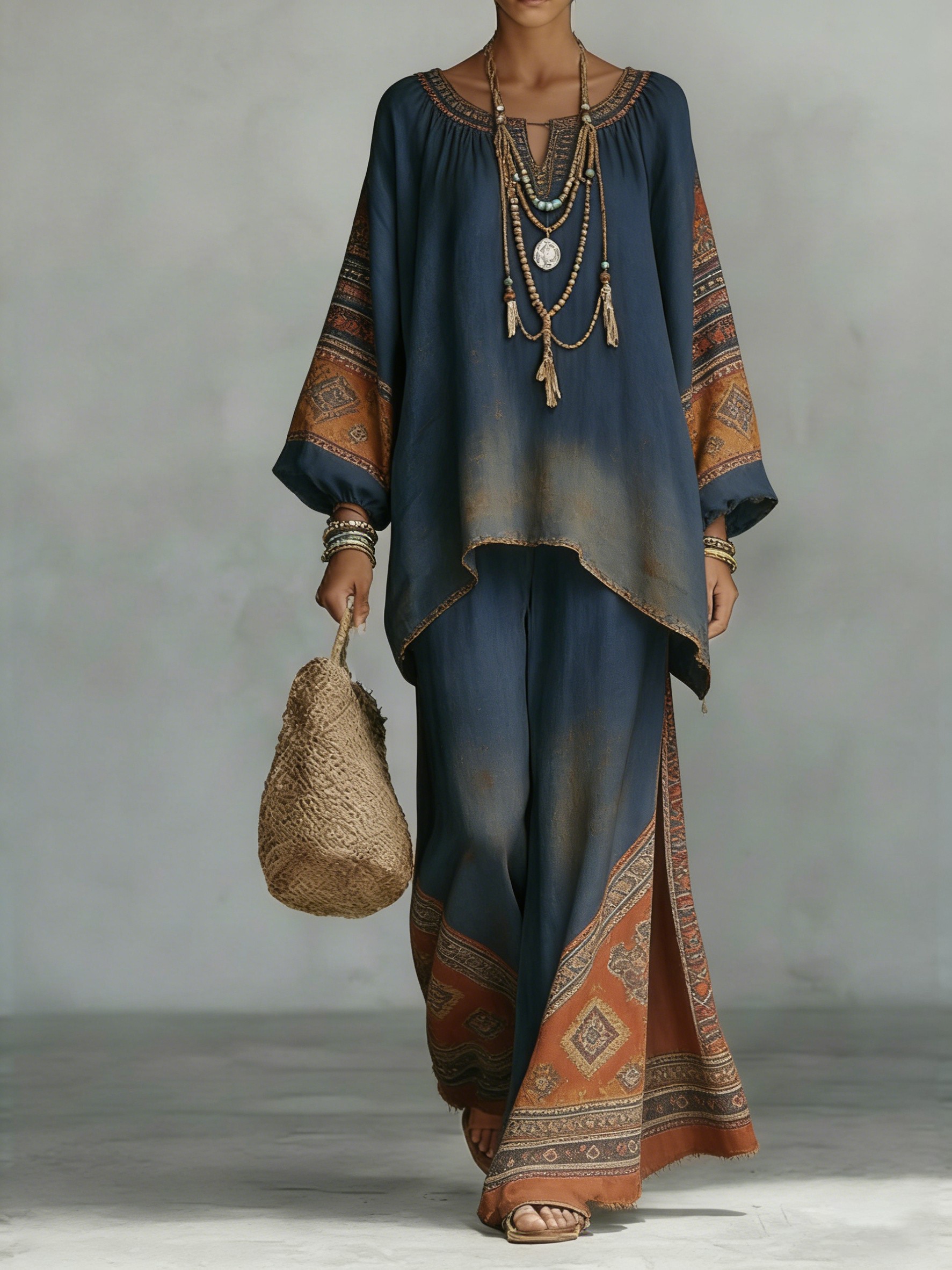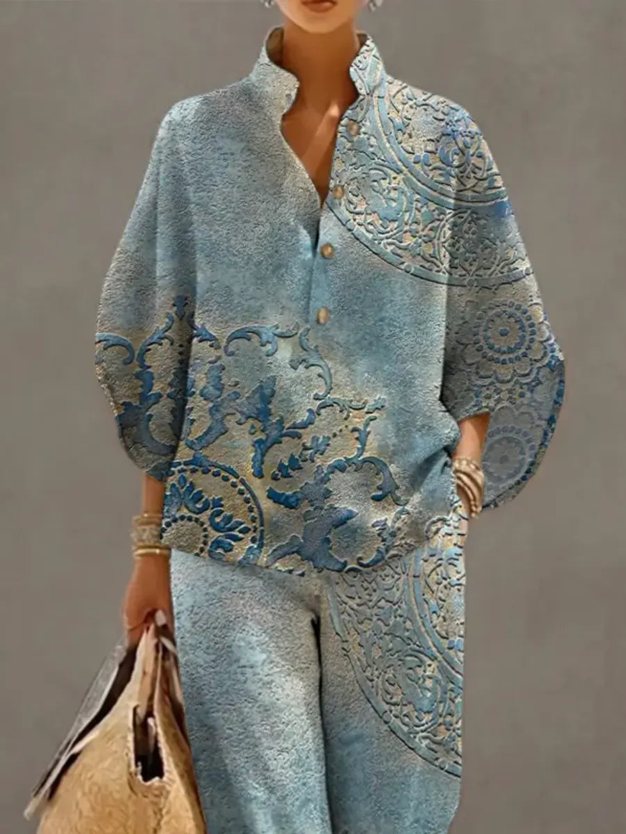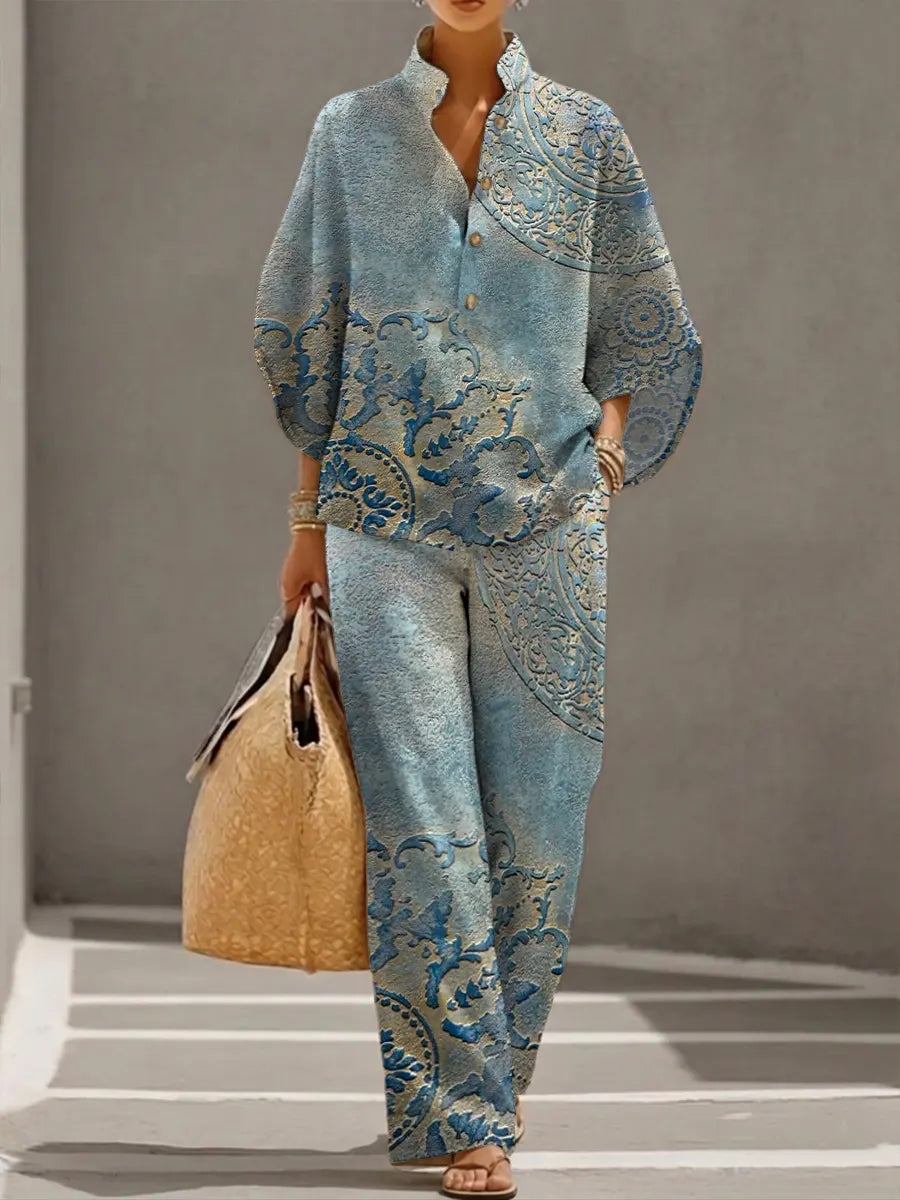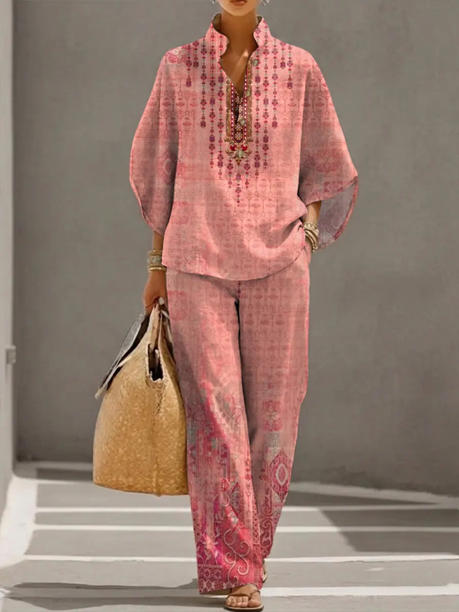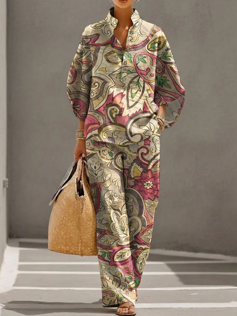 Women's Vintage Art Print Casual Cotton-linen Two-piece Set