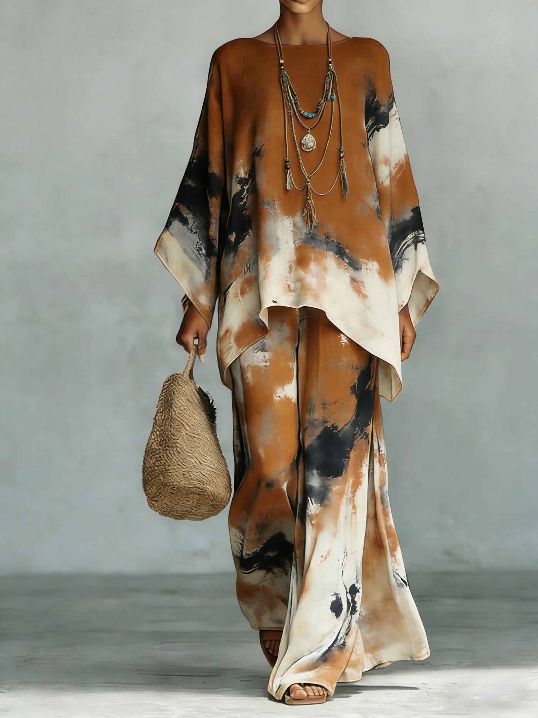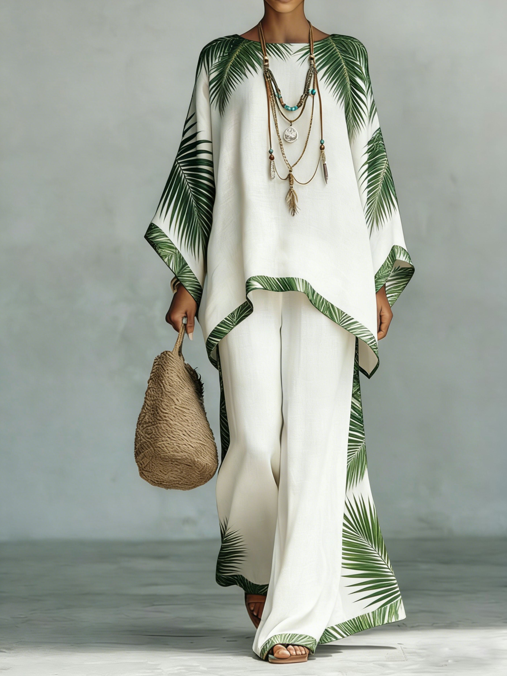 Women's Comfortable and loose print pattern cotton and linen wide-leg pants two-piece set