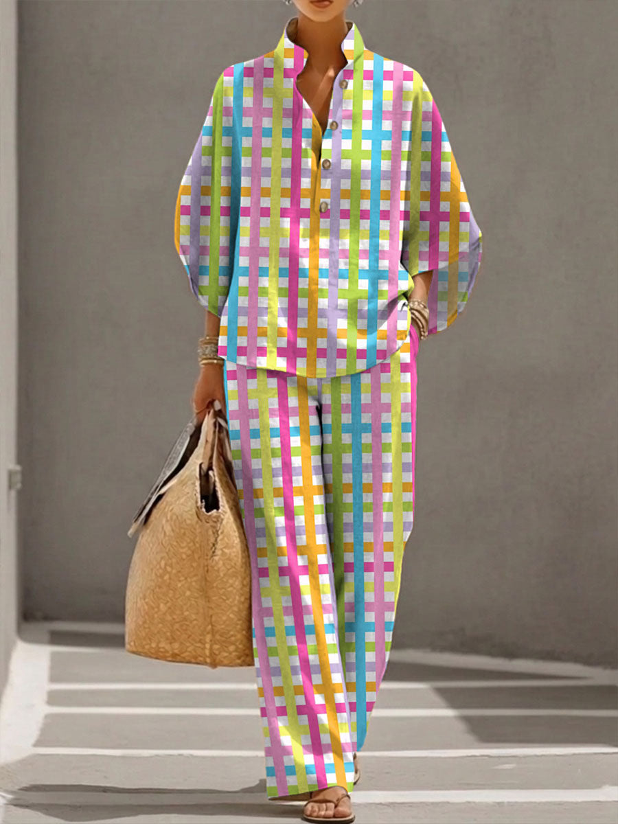 Women's Pink Plaid Print Casual Cotton-linen Two-piece Set