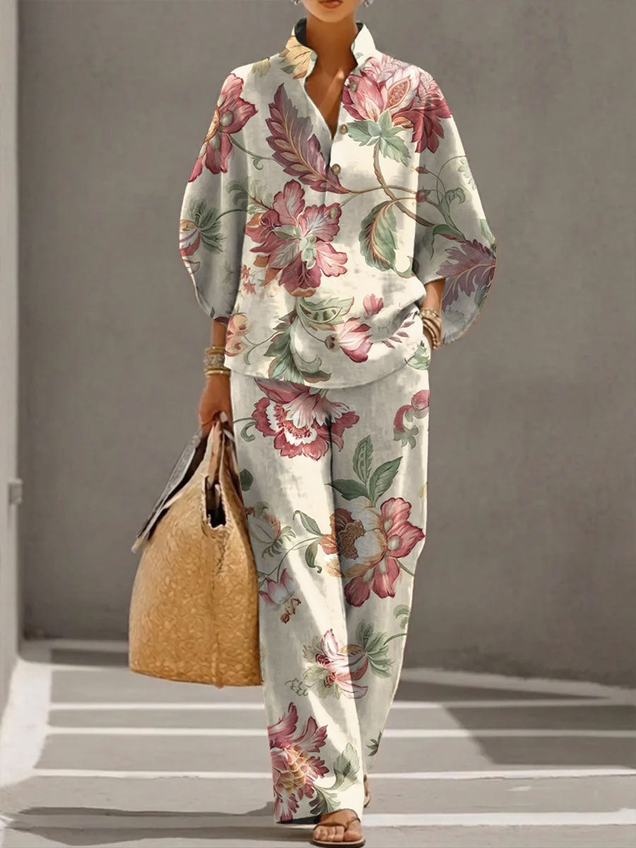 Women's Retro Floral Art Print Casual 3/4 Sleeve Top And Pants Cotton Linen Suits