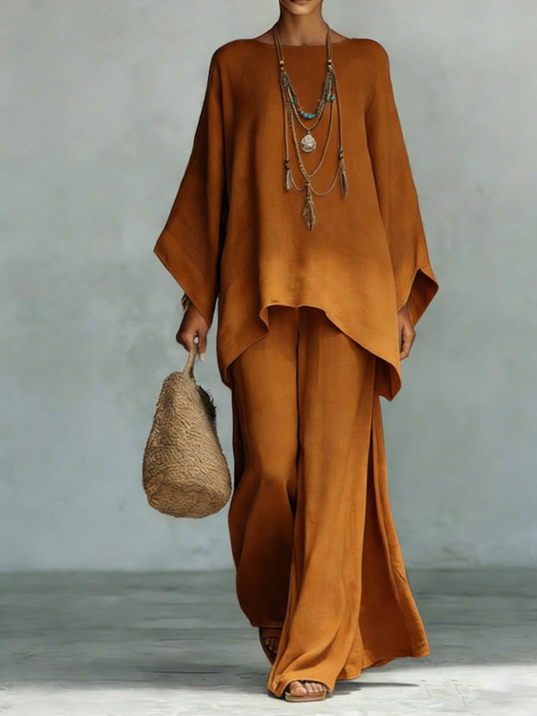 Women's Comfortable and loose print pattern cotton and linen wide-leg pants two-piece set