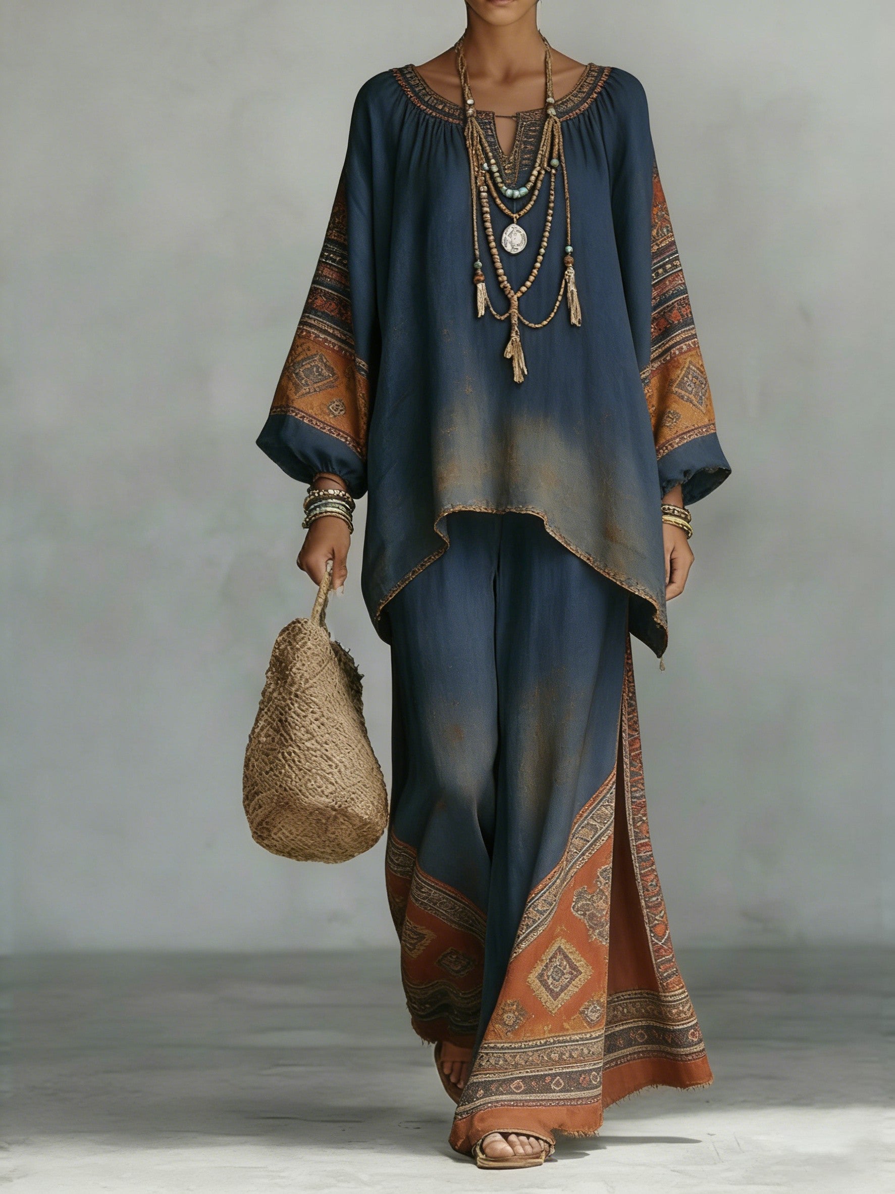 Women's Comfortable and loose print pattern cotton and linen wide-leg pants two-piece set