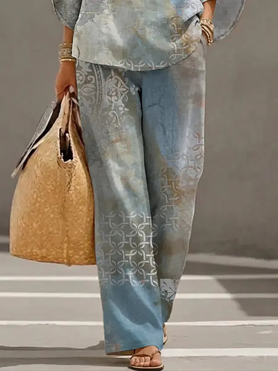 Women's Retro Floral Art Print Casual 3/4 Sleeve Top And Pants Cotton Linen Suits