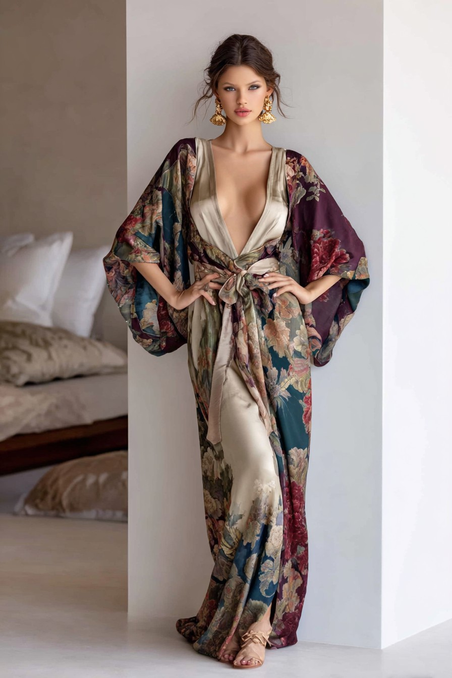Women's Vintage V-neck Floral Bohemian Pastoral Style Long-sleeved Maxi Long Dress