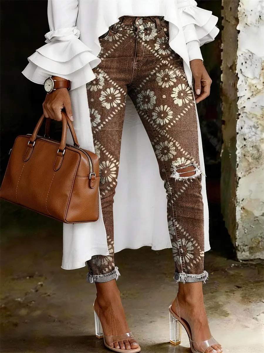 Women's Fashion Casual Retro Argyle Flowers Print Ripped Skinny Jeans
