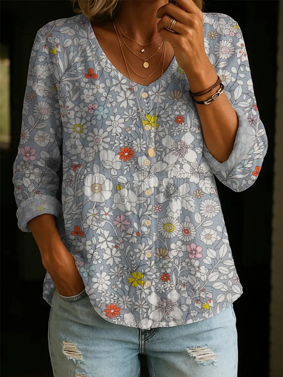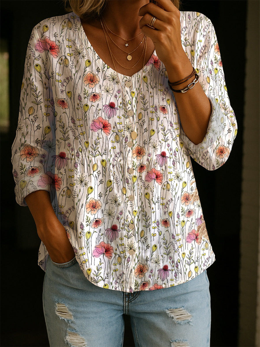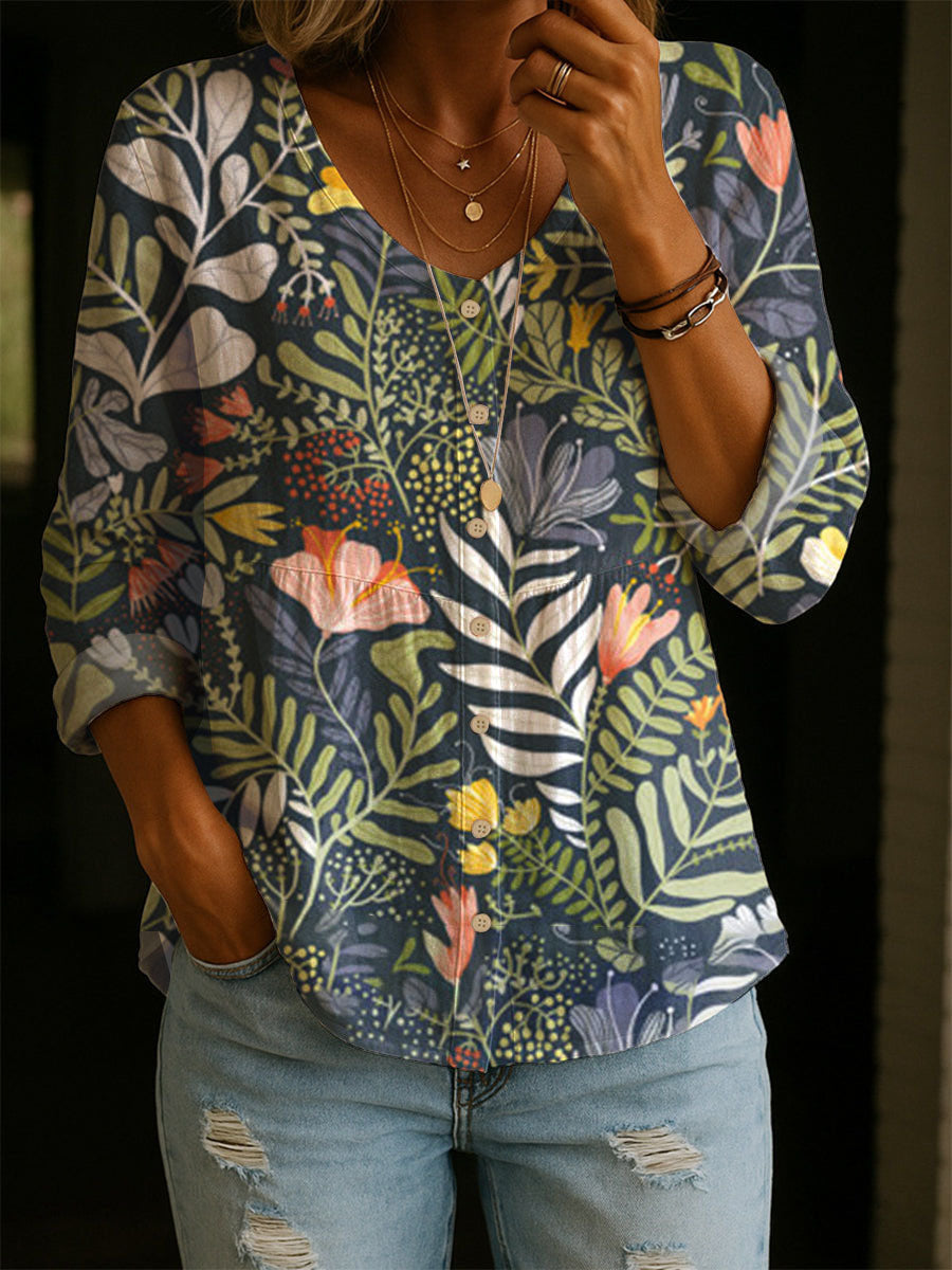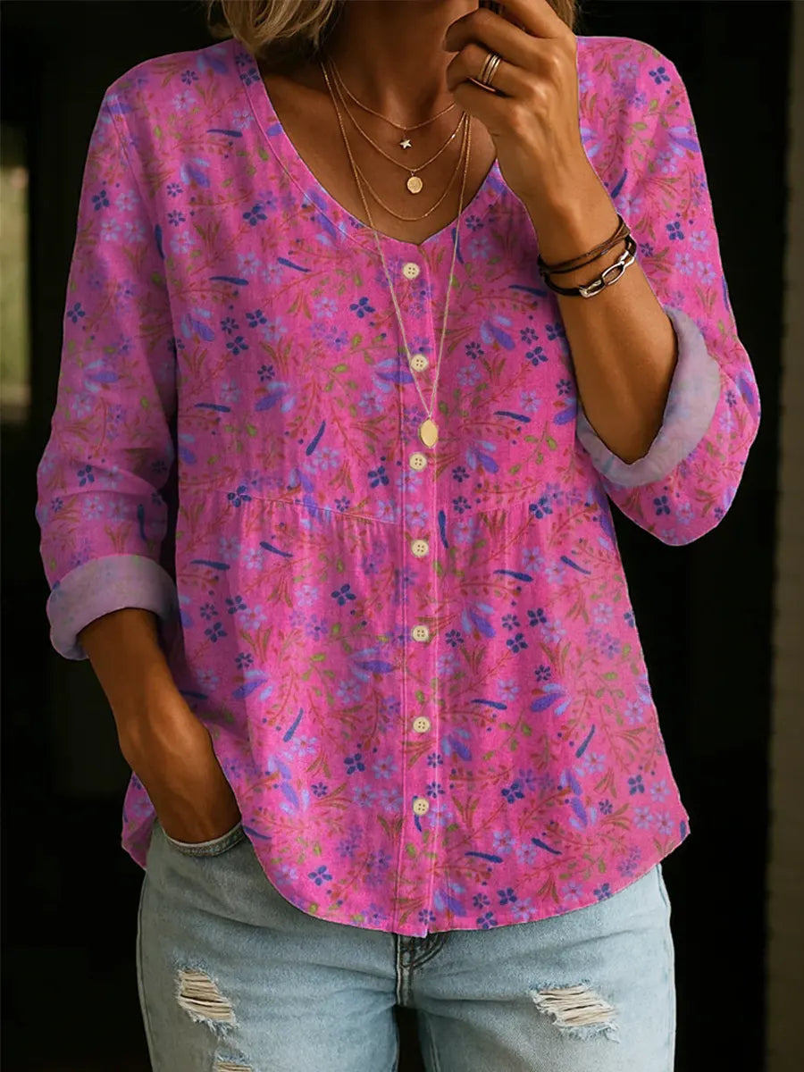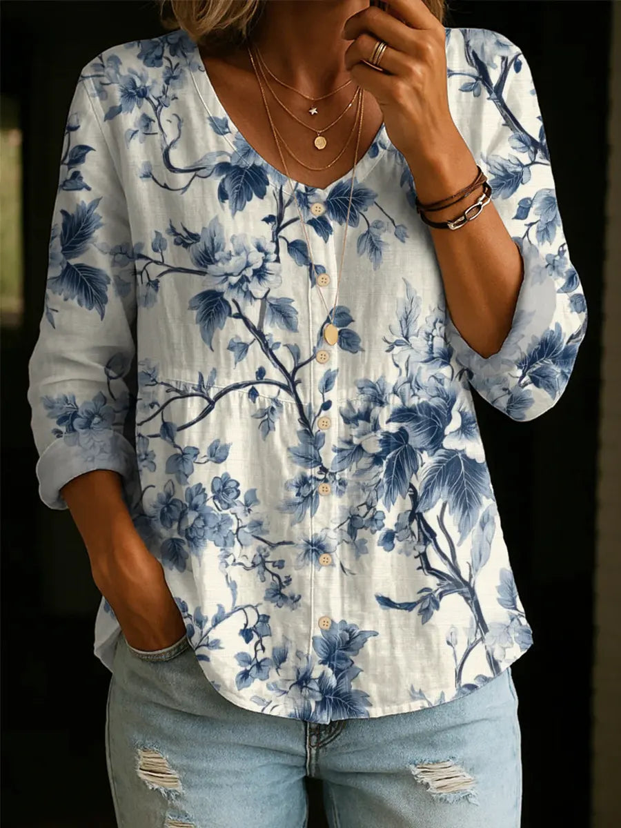 Women's Vintage Flower Art Print Linen Cotton Shirt
