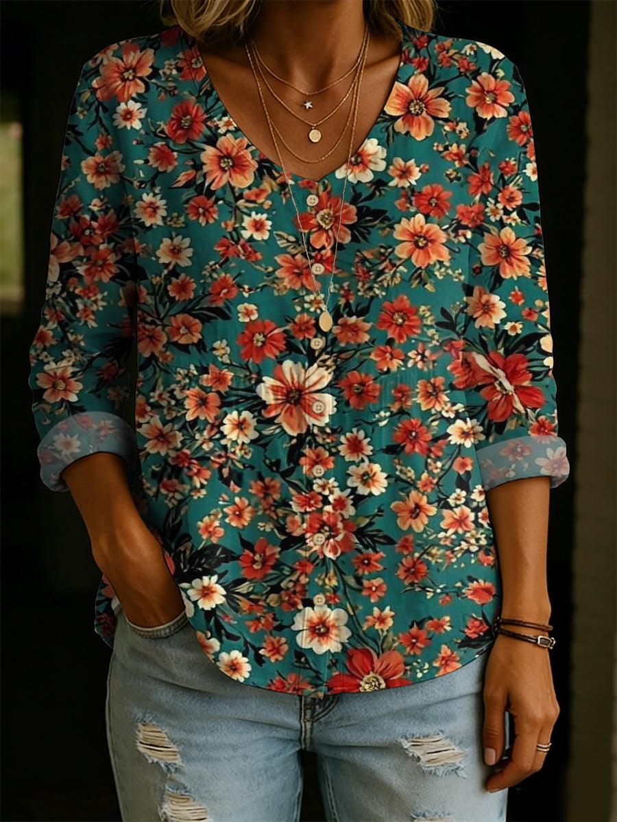 Women's Vintage Floral Pattern Art Print Casual Cotton Shirt