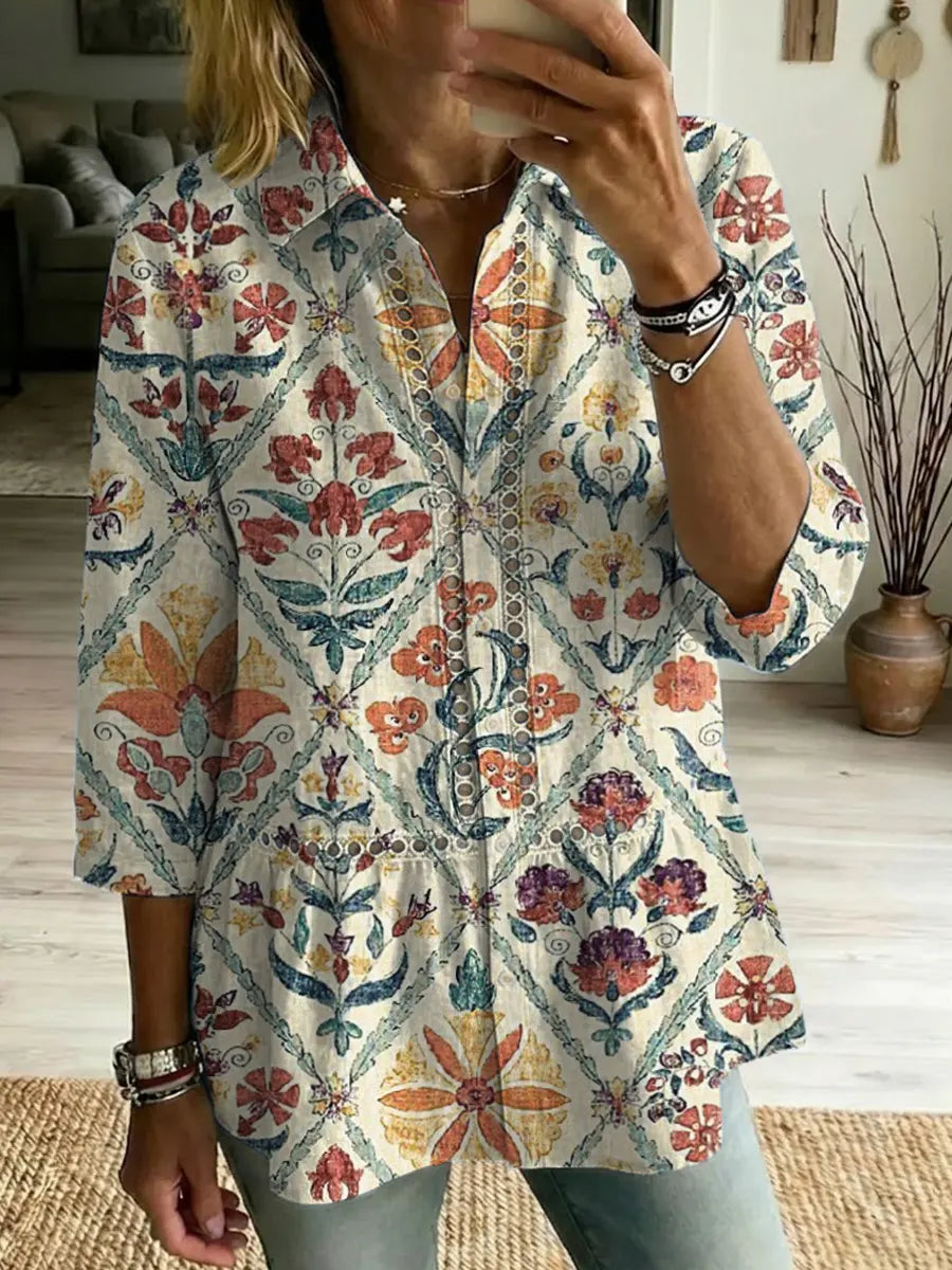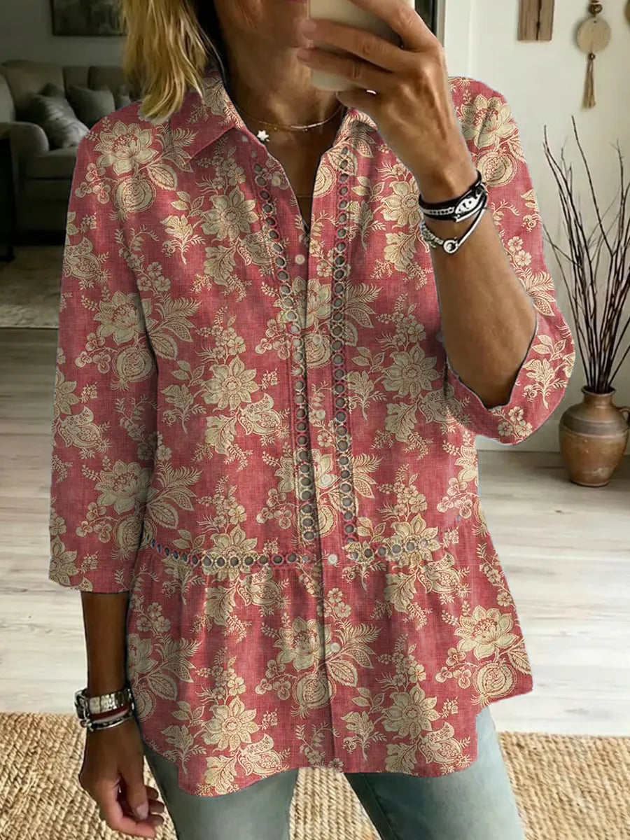 Women's Linen And Cotton Vintage Elegant Floral Pattern Shirt