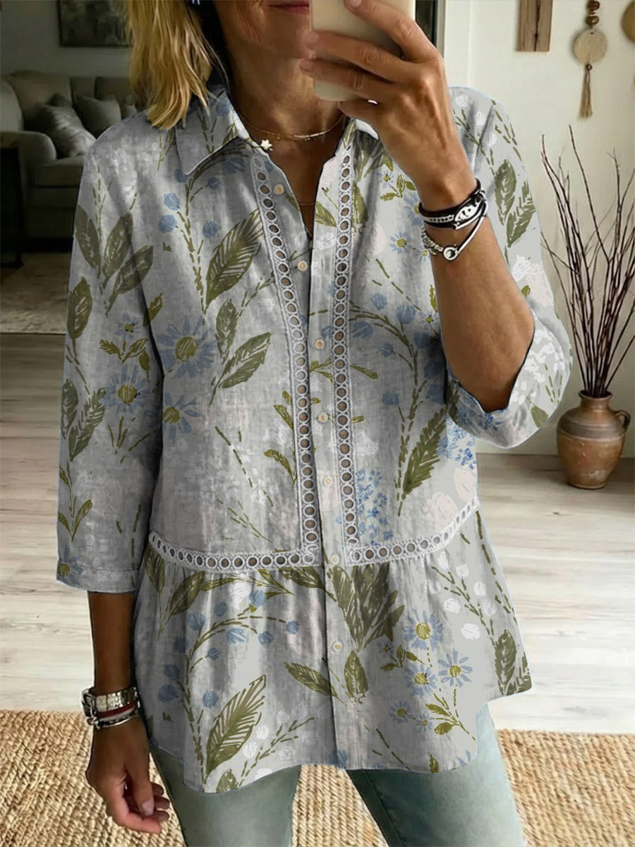 Women's Elegant Floral Decorative Pattern Linen And Cotton Shirt