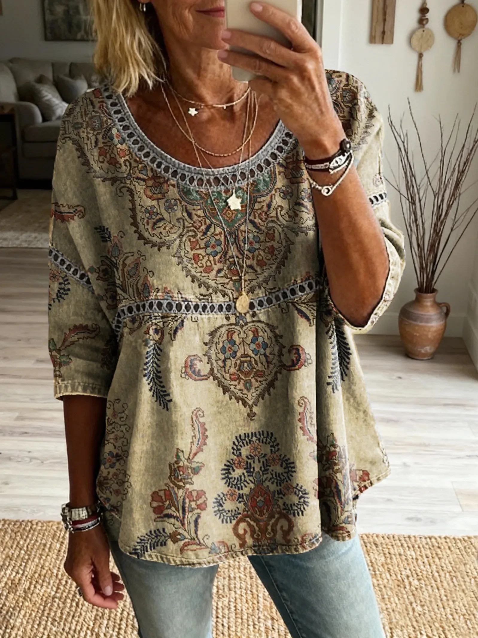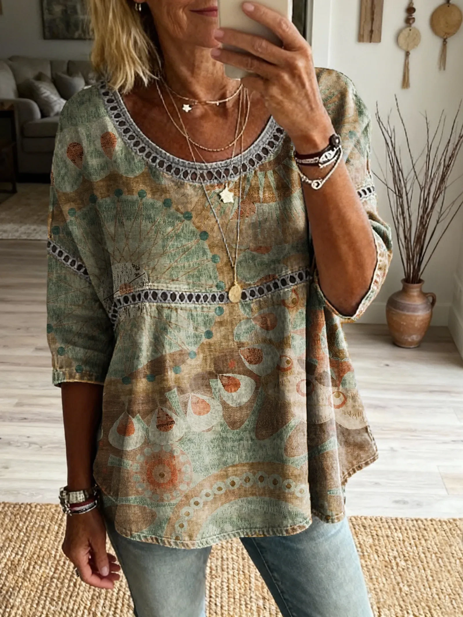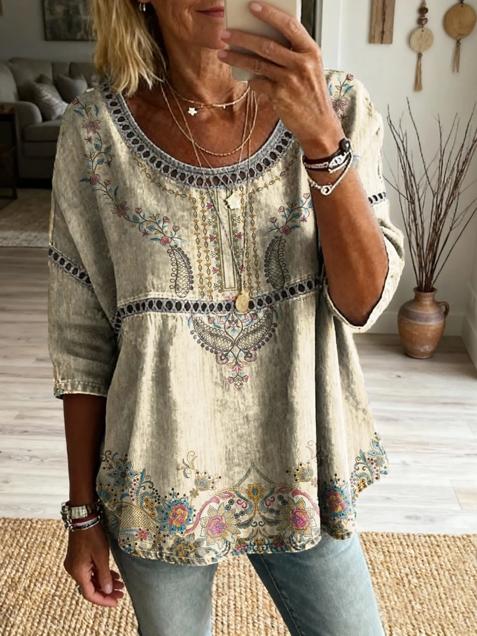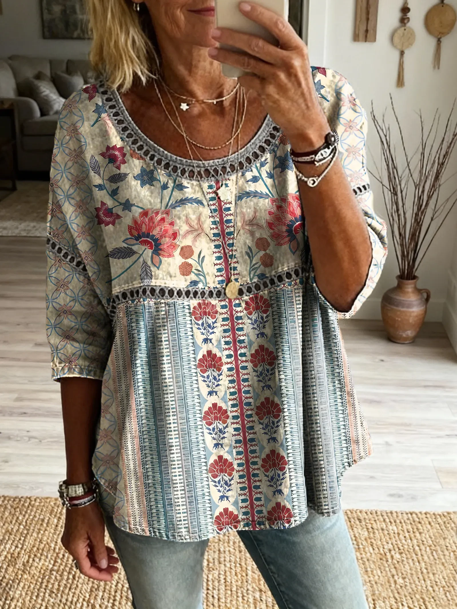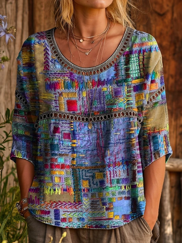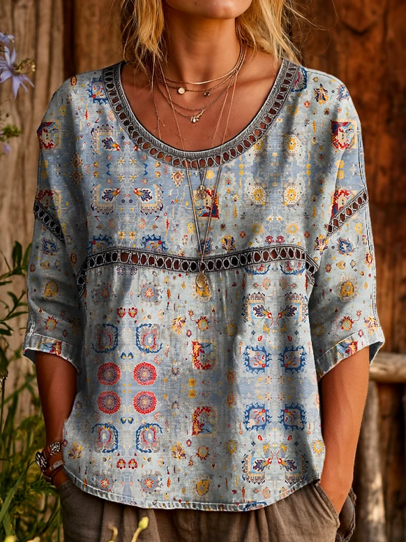 Ethnicity Bohemia Flowers Geometry Women's Art Print Casual Round Neck Cutout Top