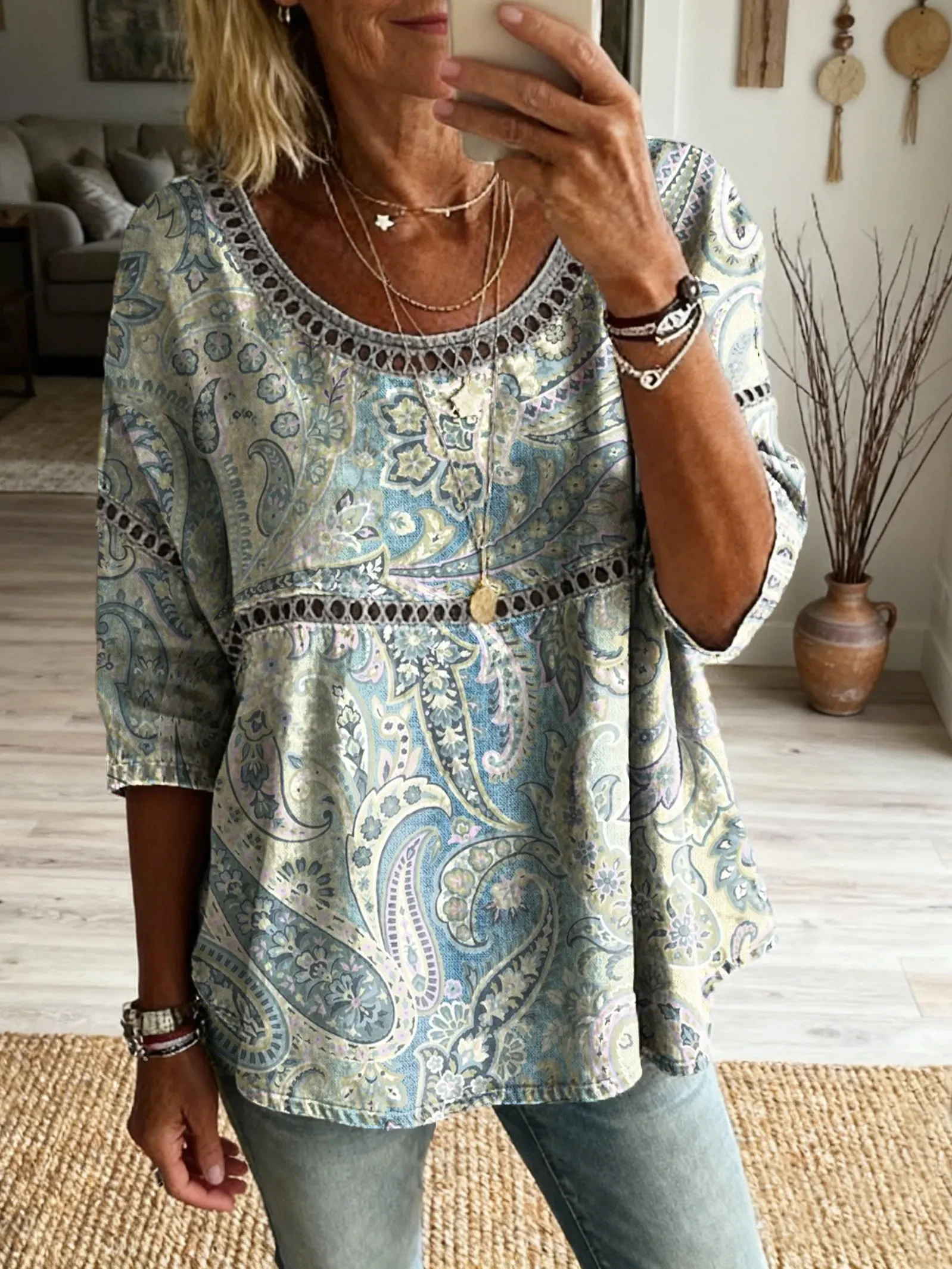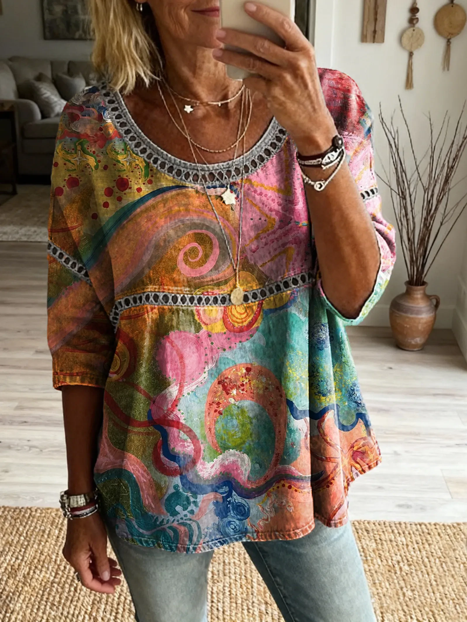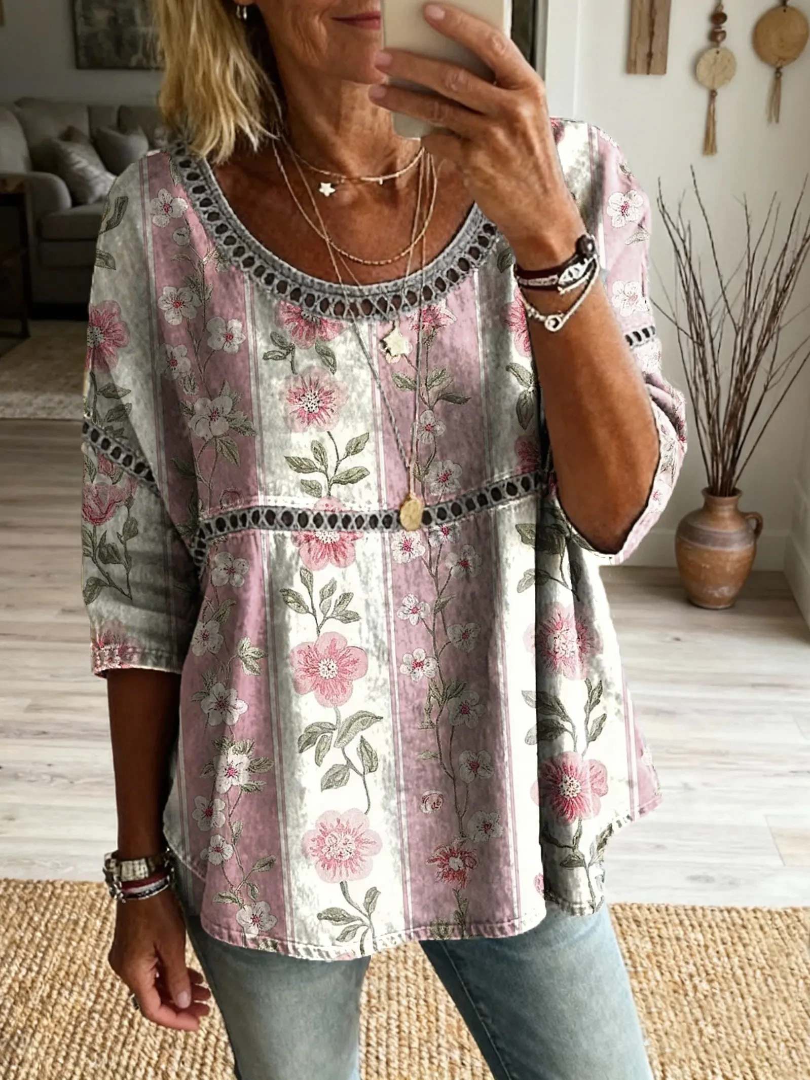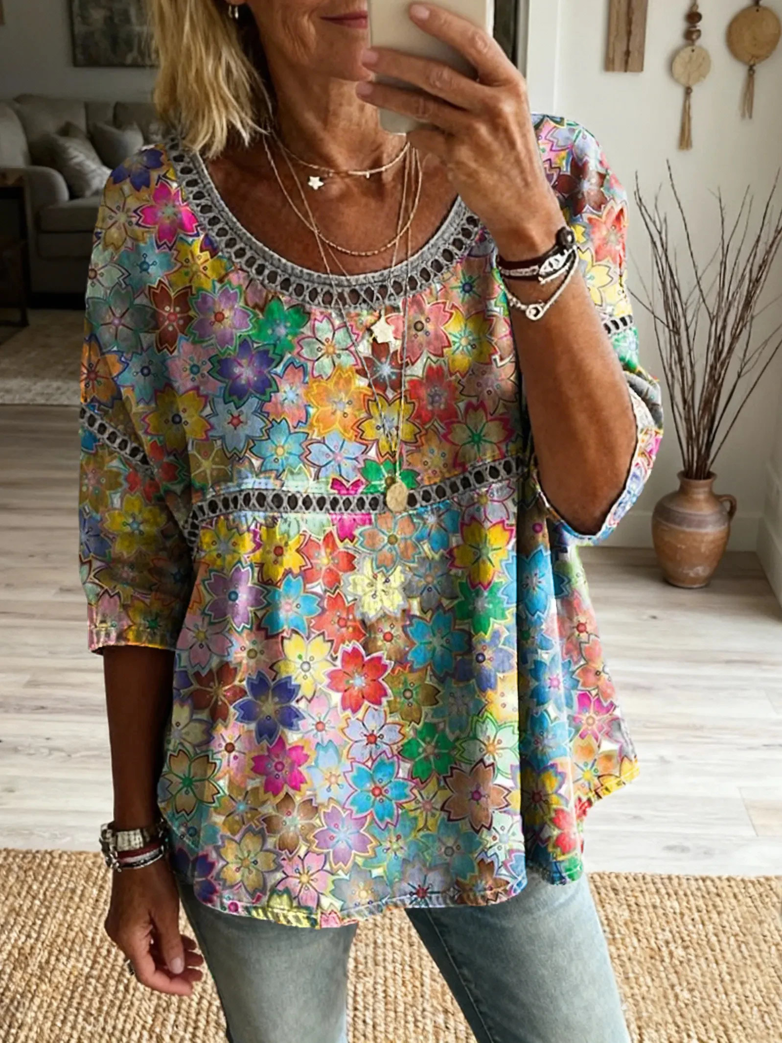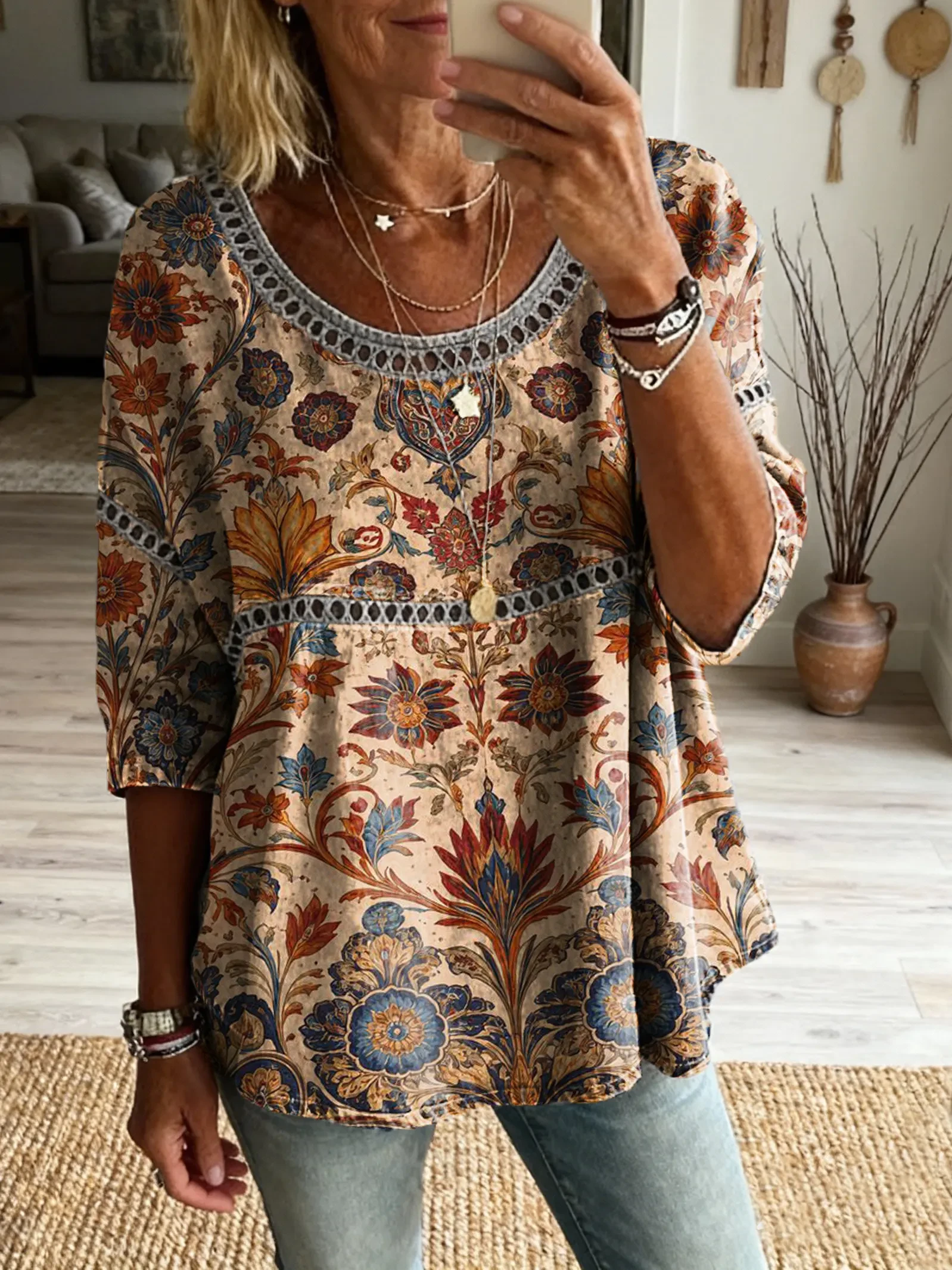 Ethnicity Bohemia Flowers Geometry Women's Art Print Casual Round Neck Cutout Top