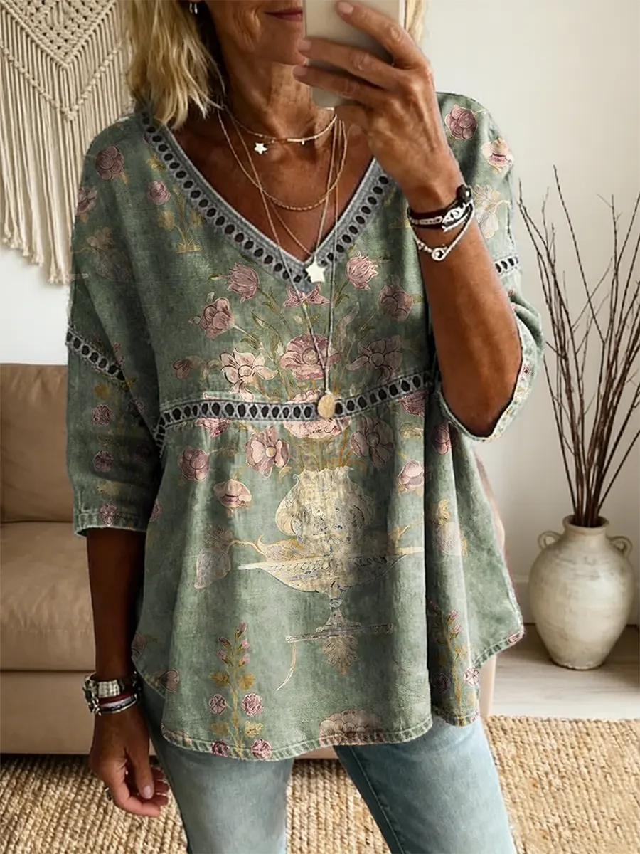 Ethnicity Bohemia Flowers Women's Vintage Art Print Casual V Neck Cutout Top