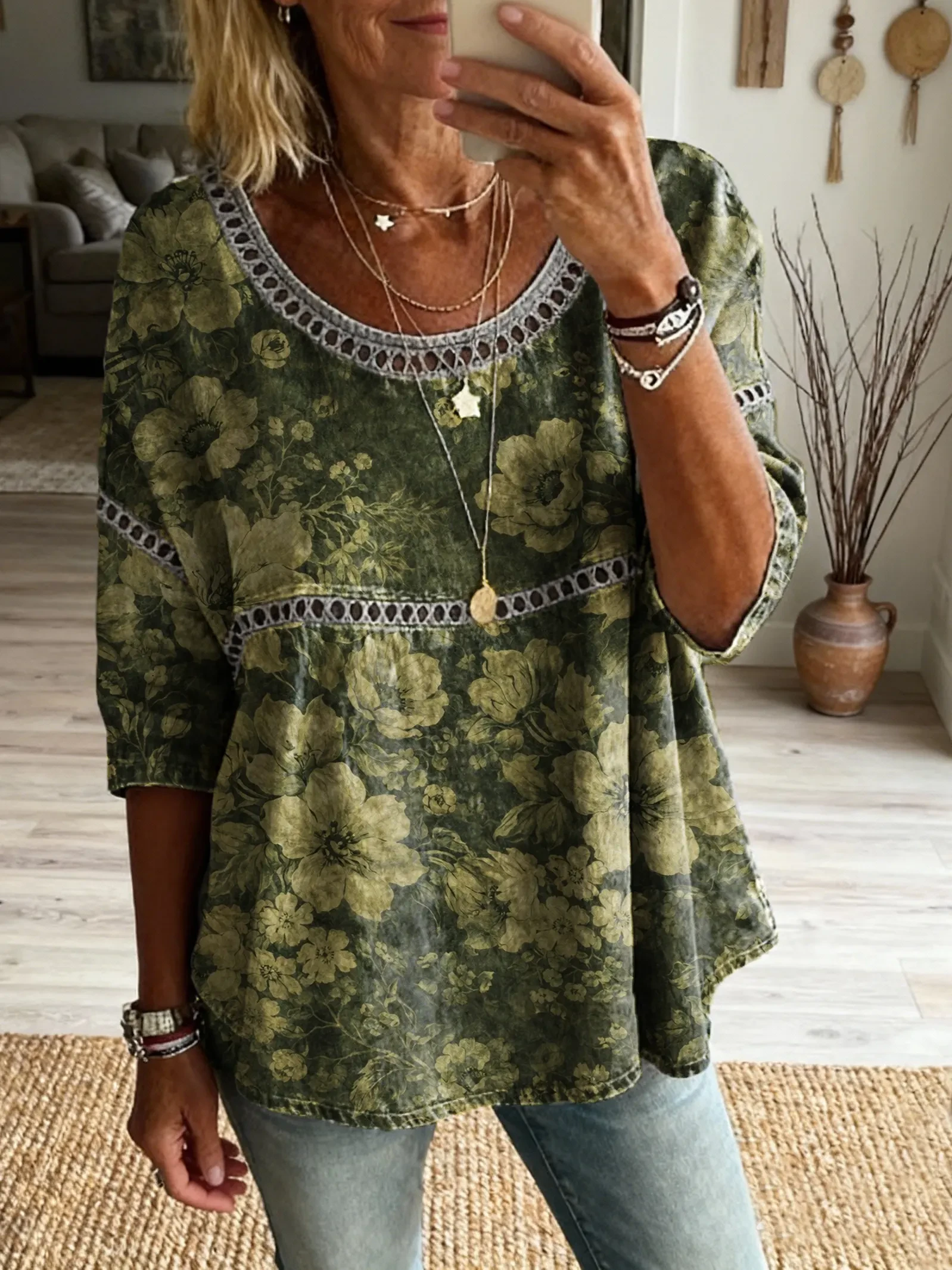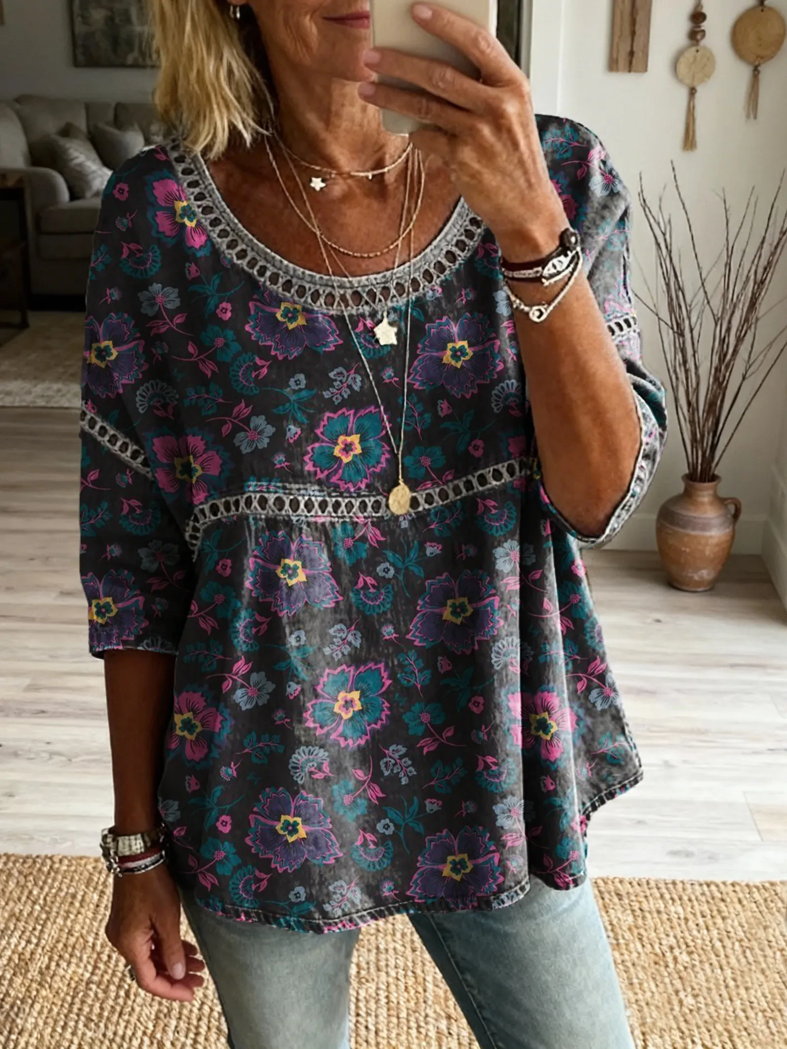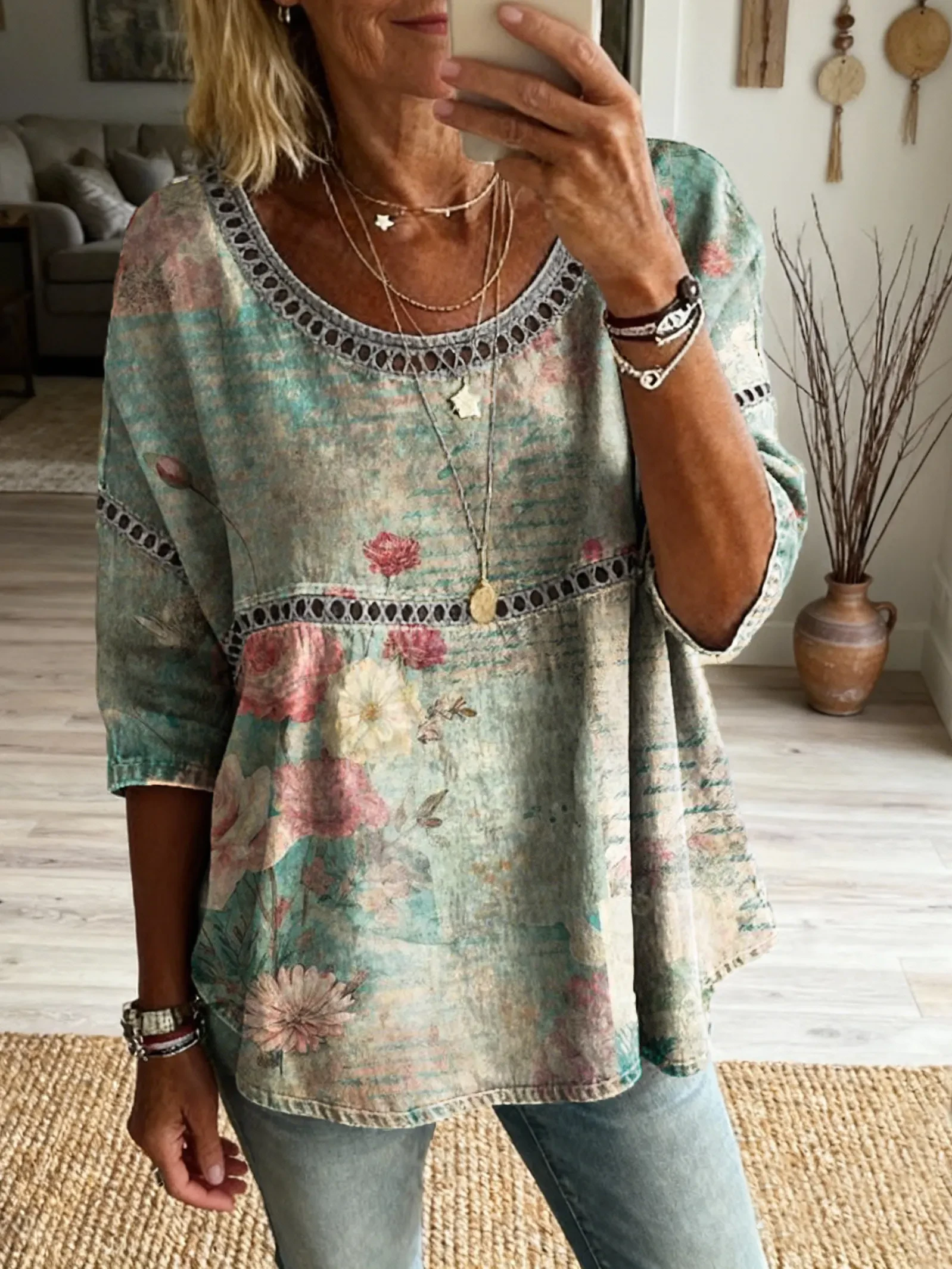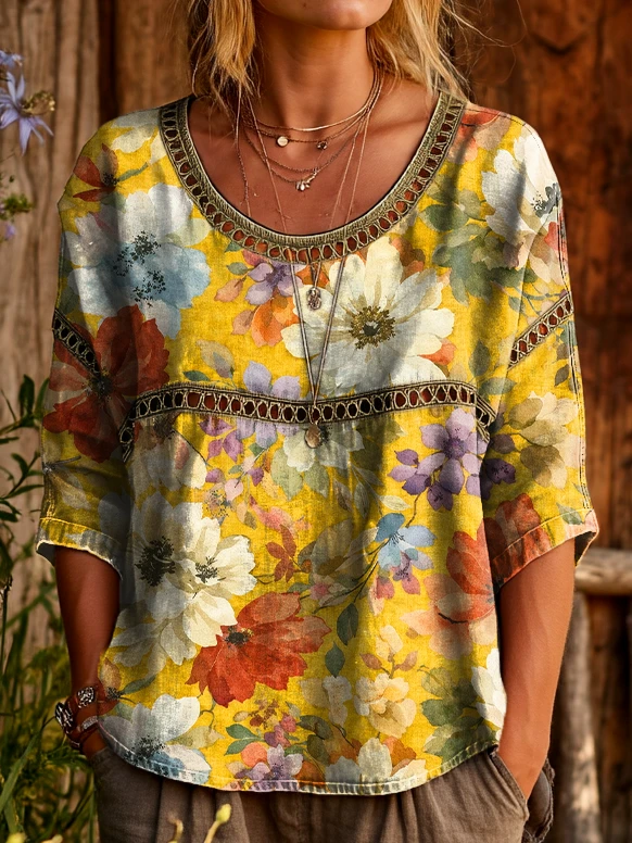 Ethnicity Retro Bohemia Flowers Women's Art Print Casual Round Neck Cutout Top