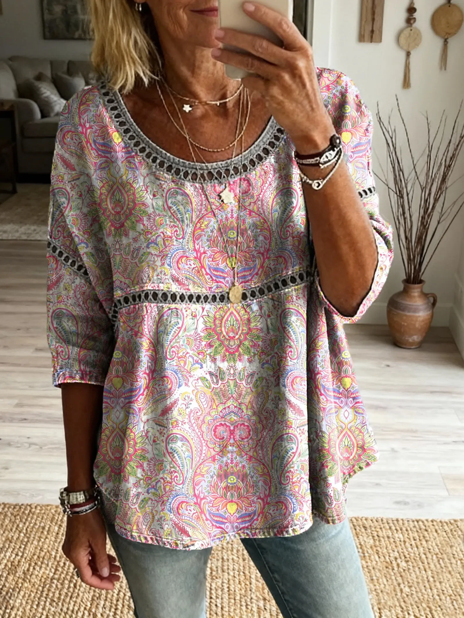 Women's Vintage Ethnic Pink Paisley Floral Art Printed Casual Round Neck Cutout Top
