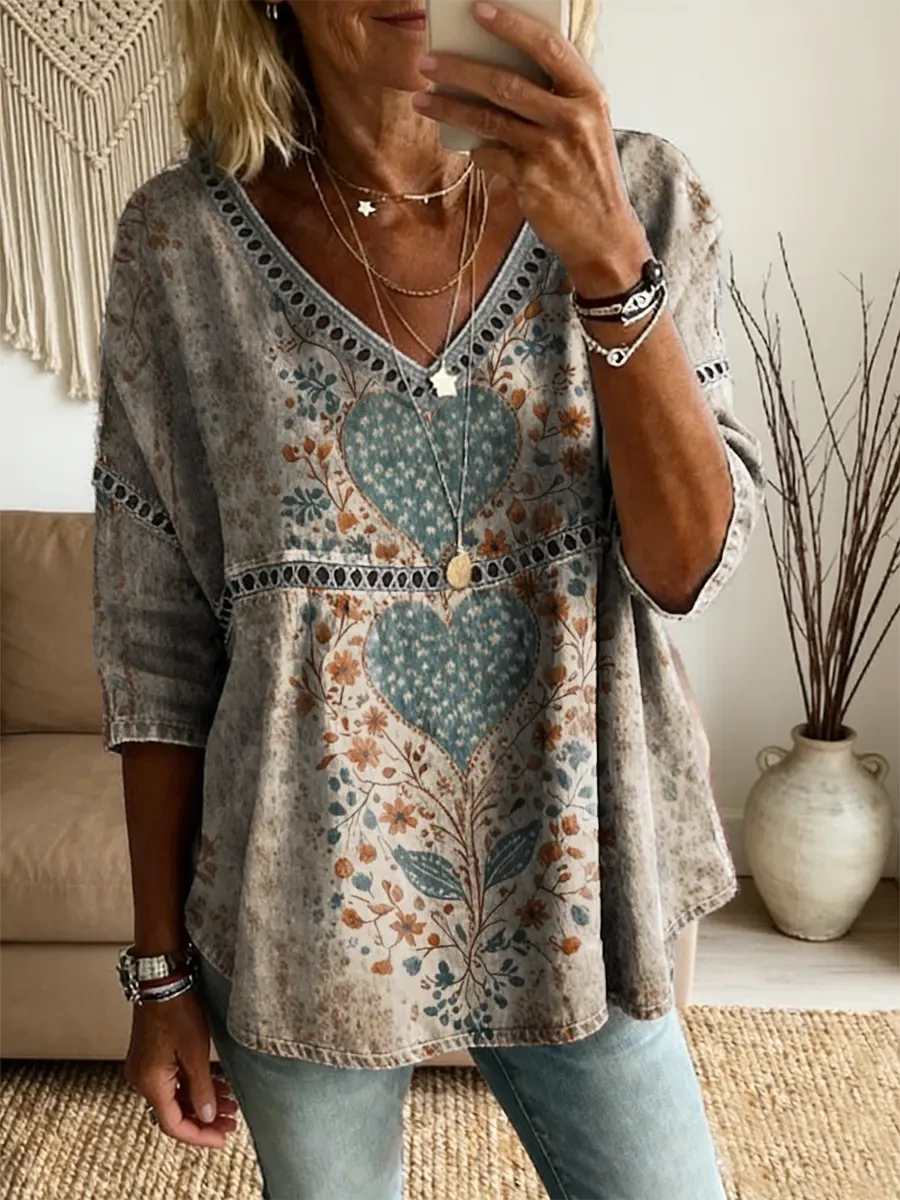 Ethnicity Bohemia Love Flowers Women's Vintage Art Print Casual V Neck Cutout Top