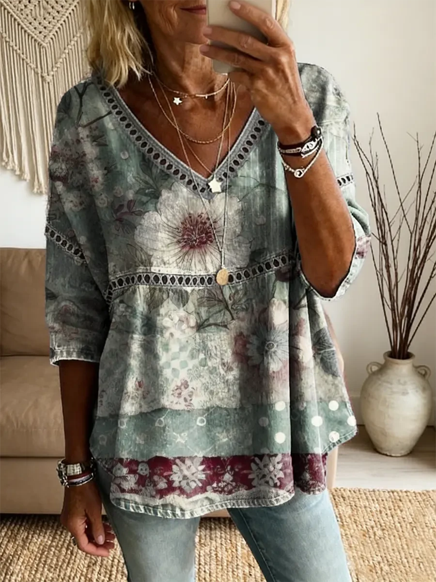 Ethnicity Bohemia Flowers Patchwork Women's Vintage Art Print Casual V Neck Cutout Top