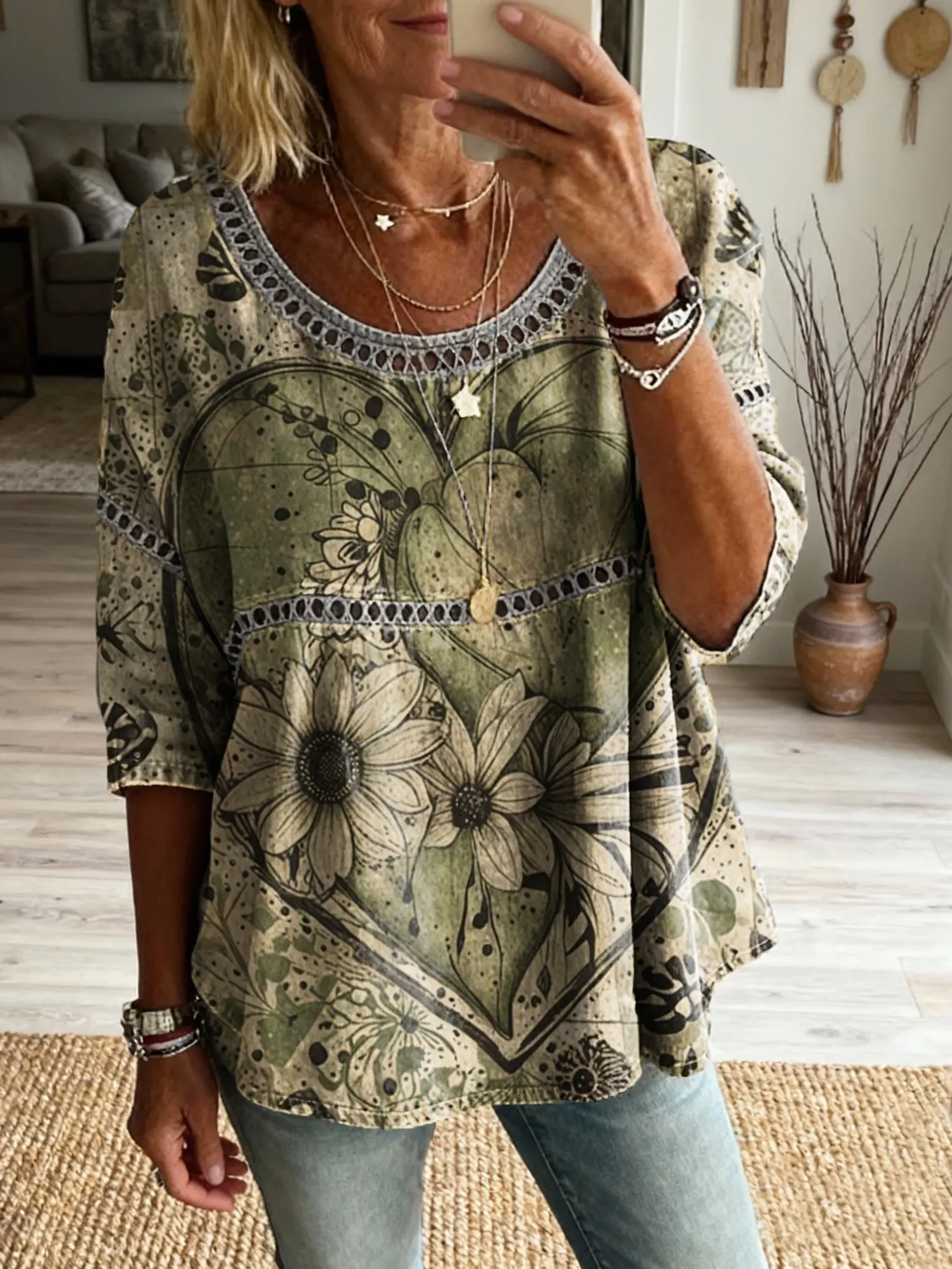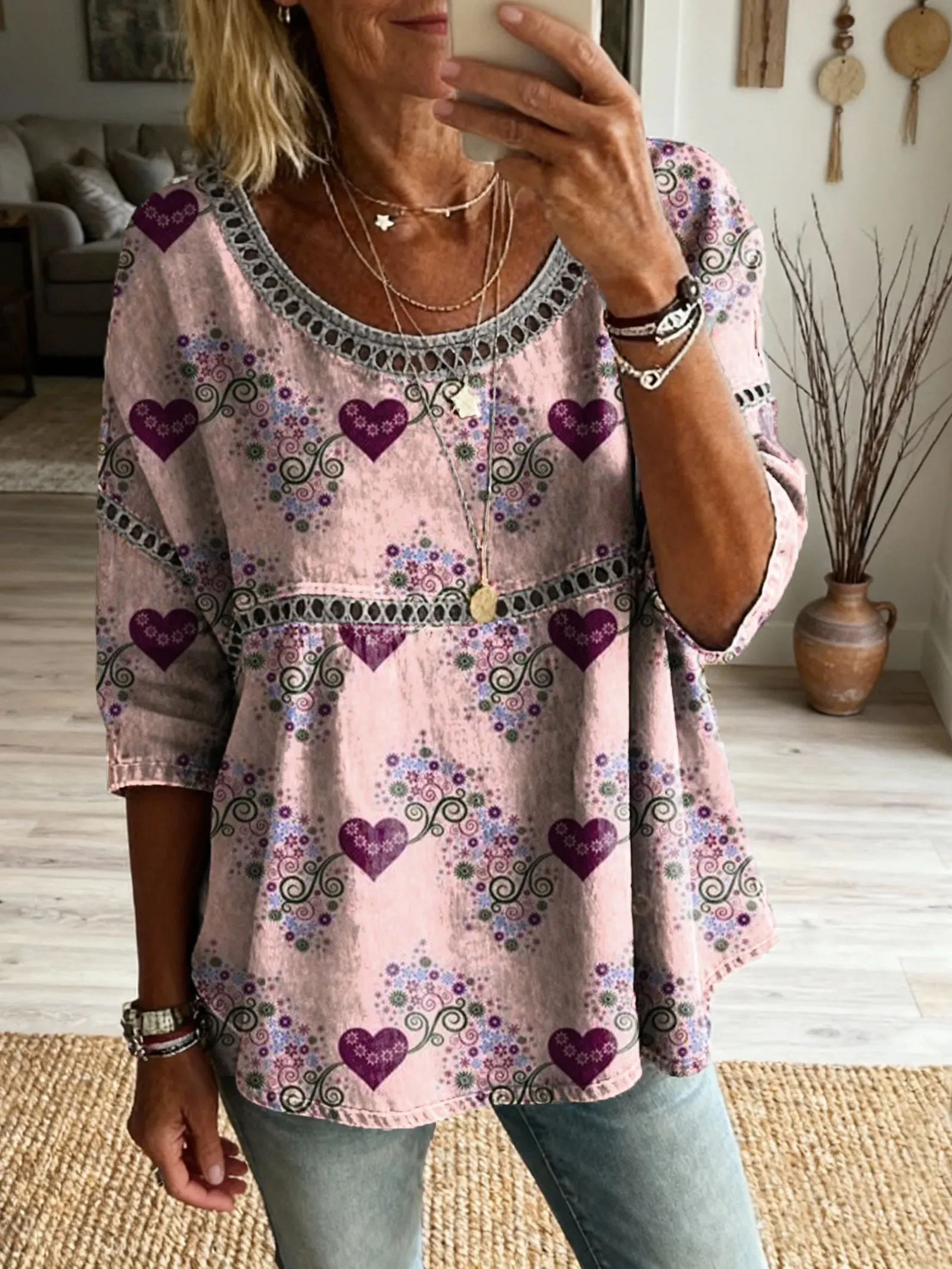 Ethnicity Bohemia Love Flowers Women's Art Print Casual Round Neck Cutout Top