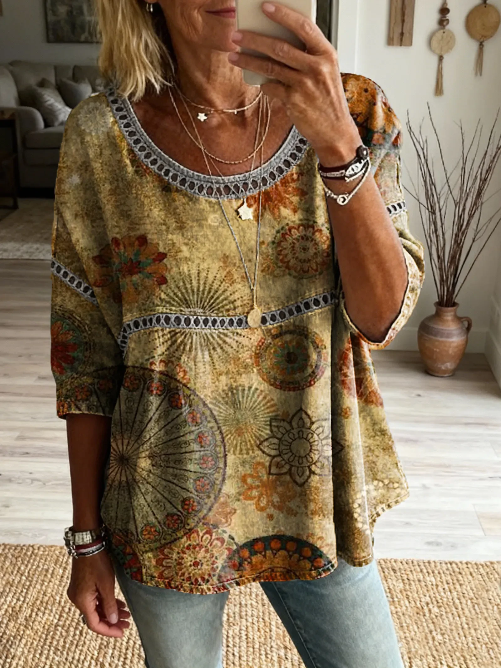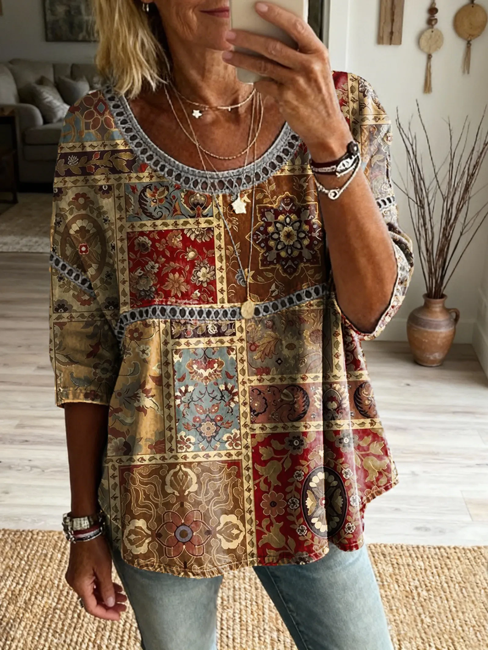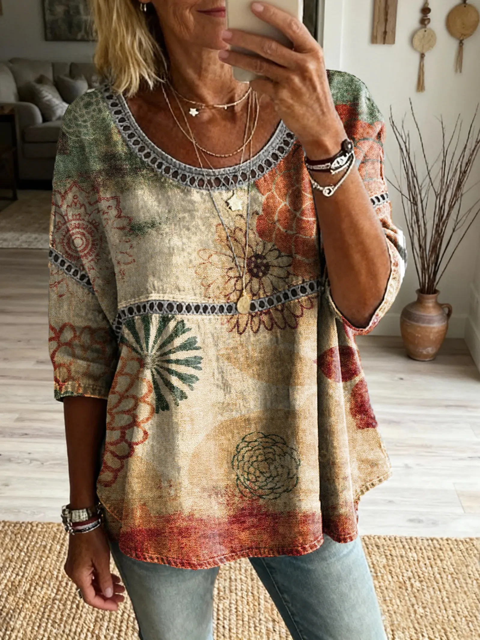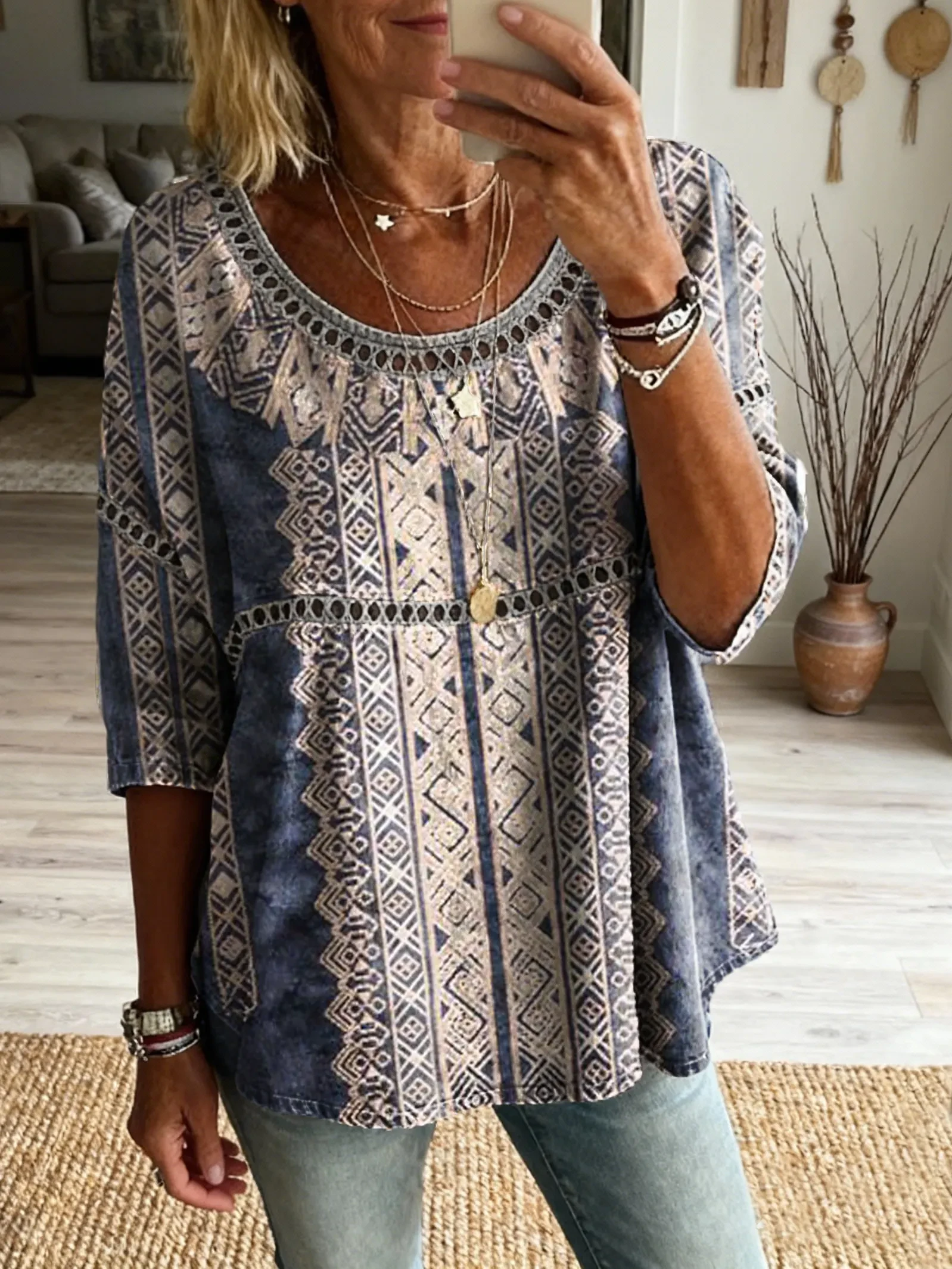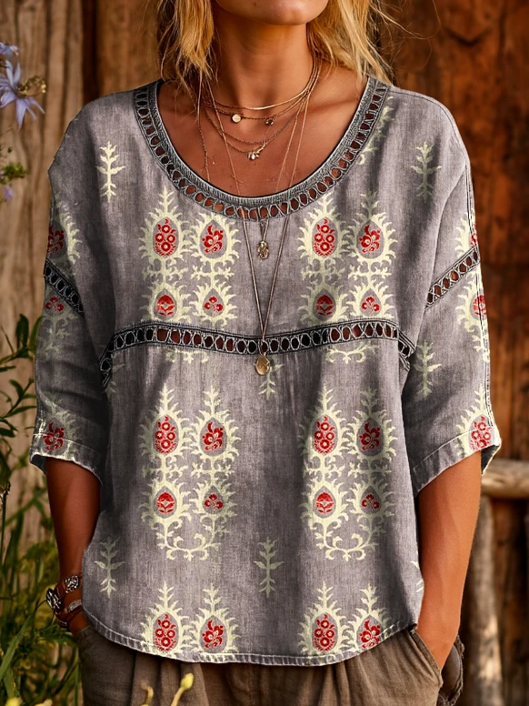 Ethnicity Geometry Bohemian Flowers Women's Vintage Art Print Casual Round Neck Cutout Top