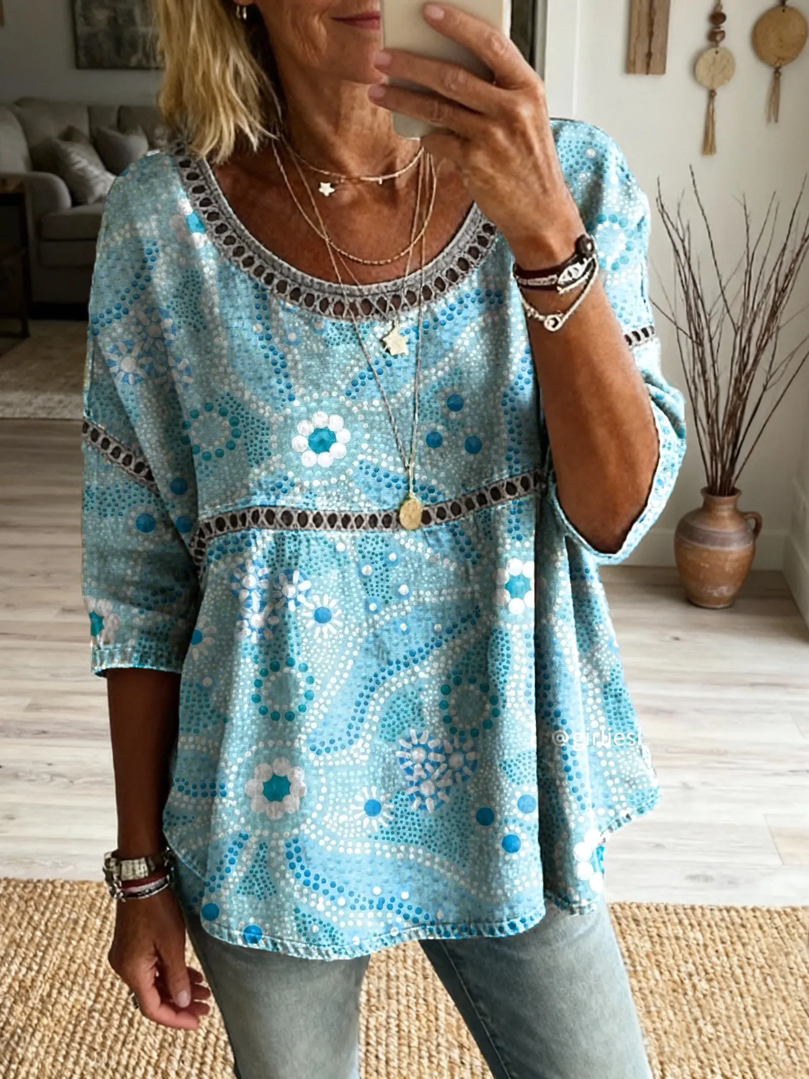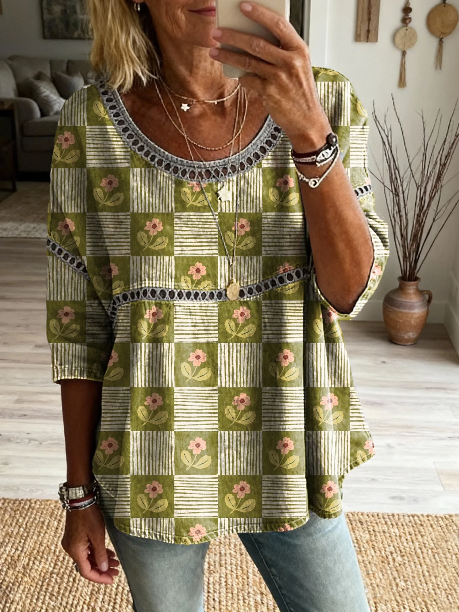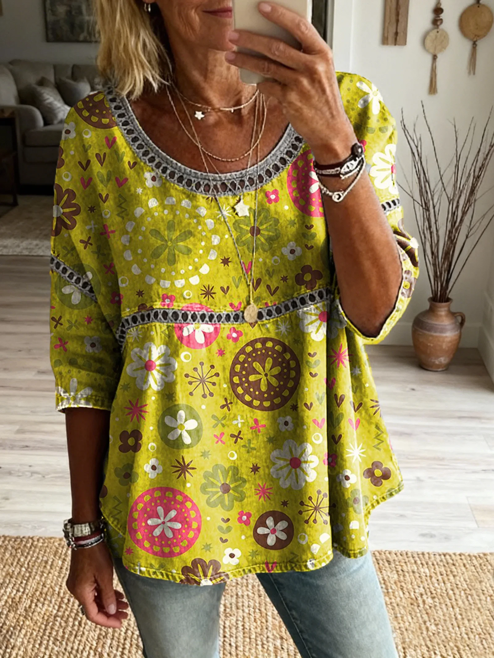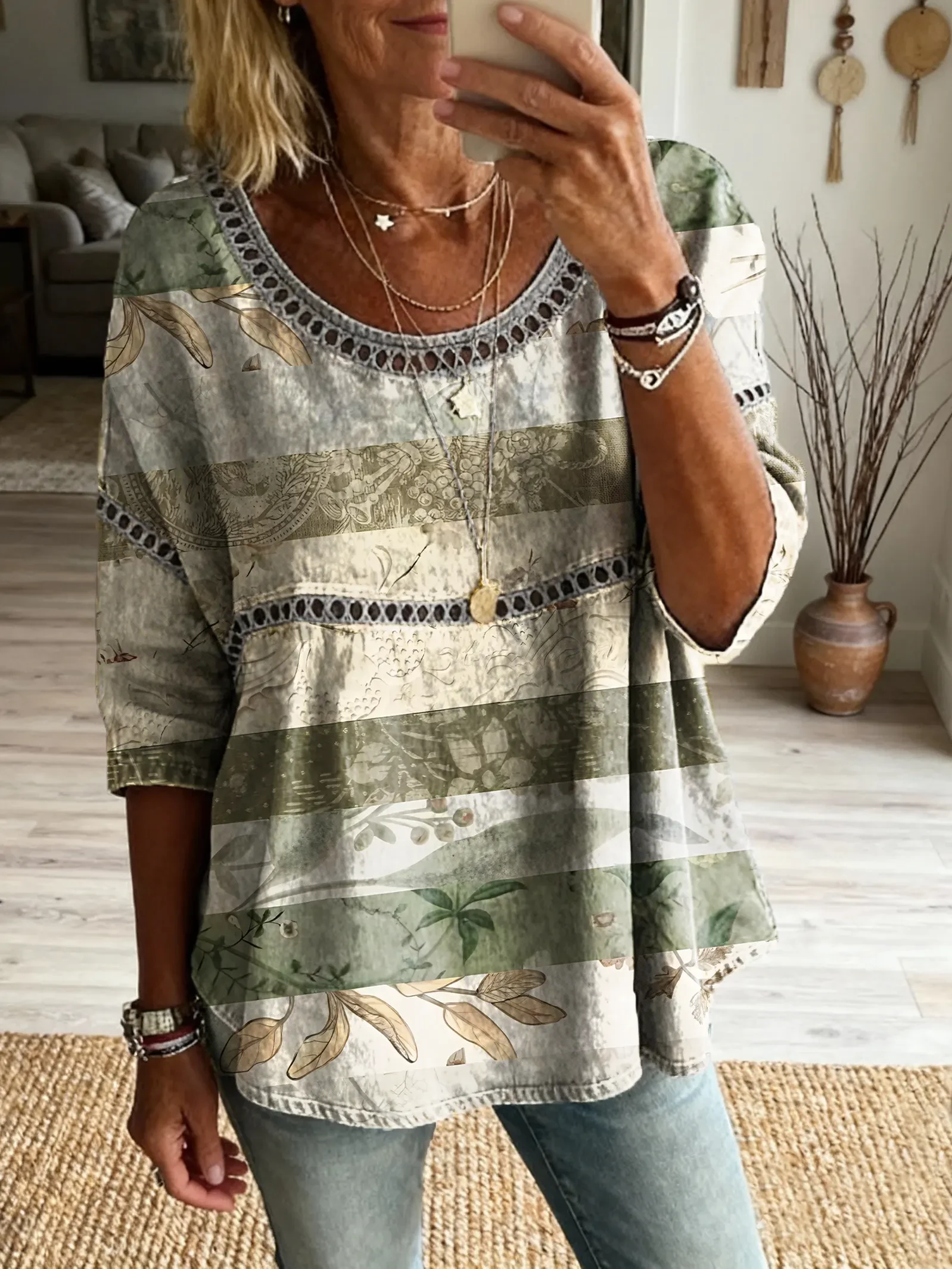 Ethnicity Geometry Bohemian Flowers Women's Vintage Art Print Casual Round Neck Cutout Top