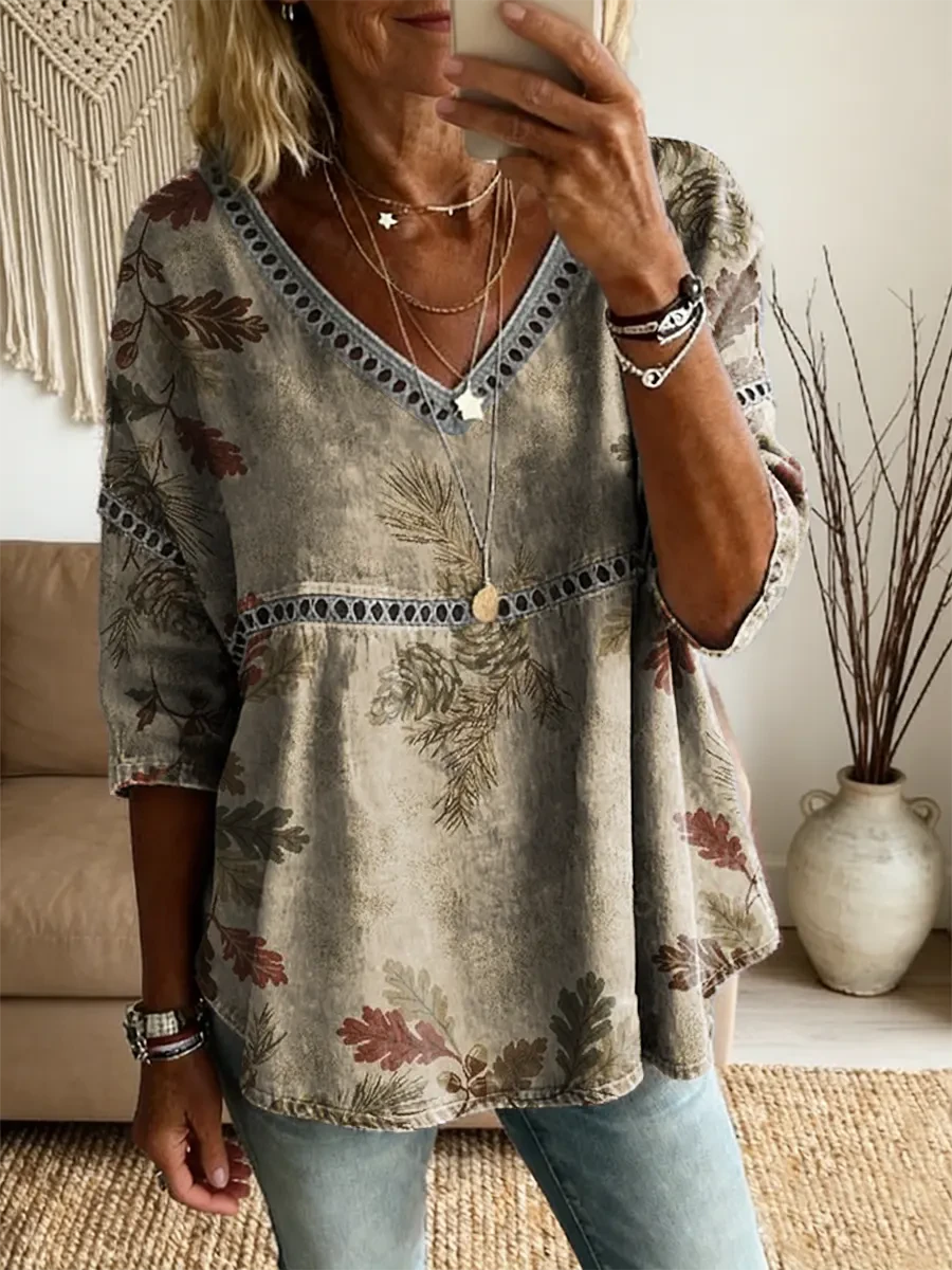 Ethnicity Bohemia Leaves Pinecone Women's Vintage Art Print Casual V Neck Cutout Top