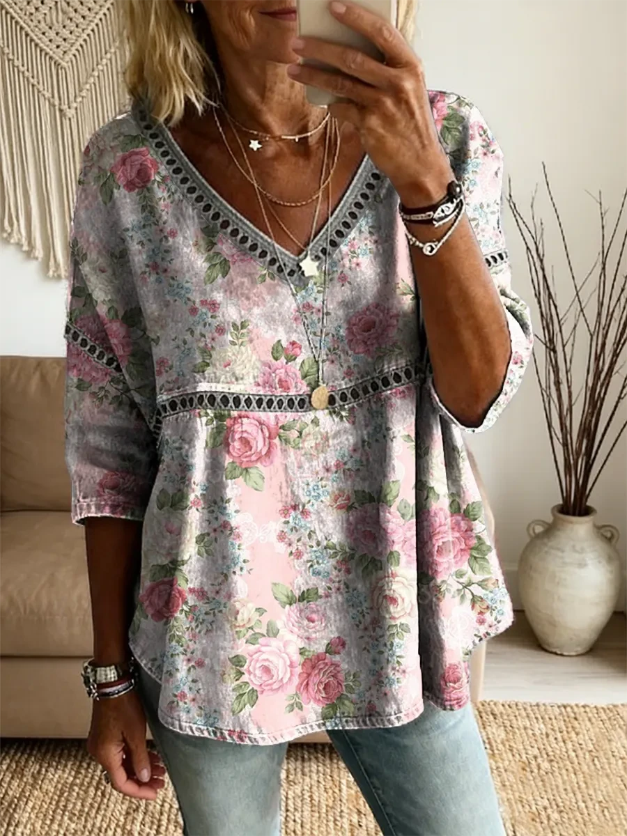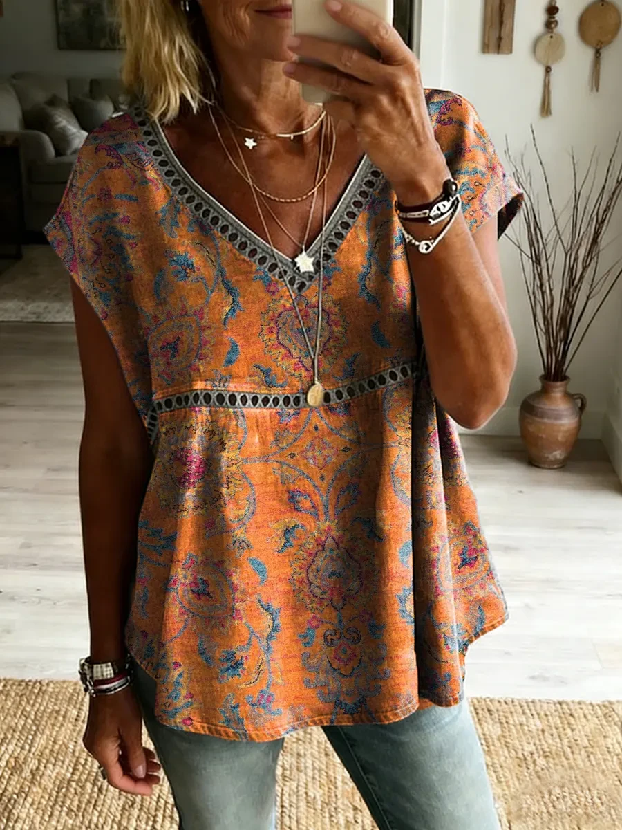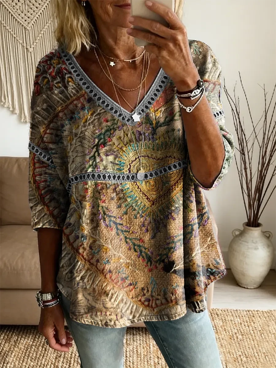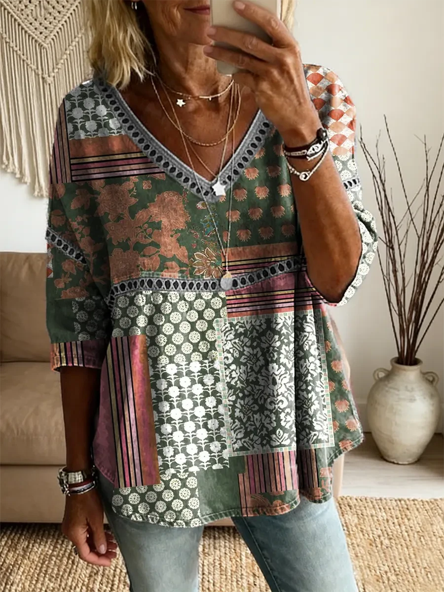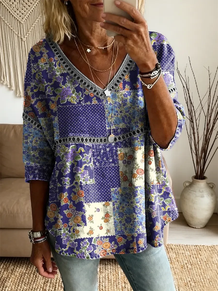 Ethnicity Patchwork Flowers Women's Vintage Art Print Casual V Neck Cutout Top