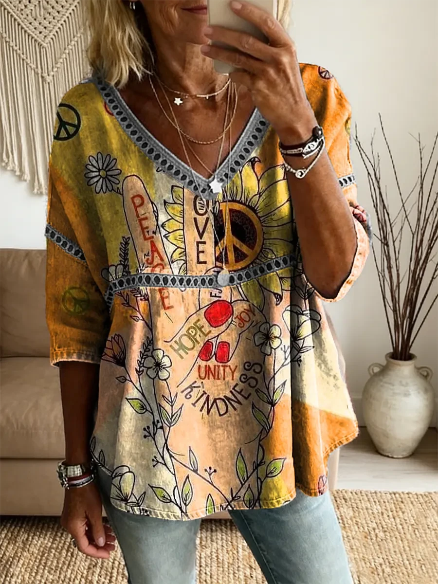 Hippie Peace Gesture Women's Vintage Art Print Casual V Neck Cutout Top