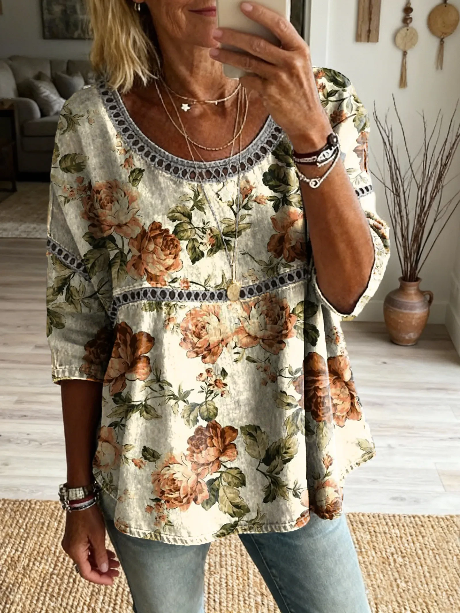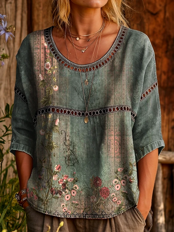 Ethnicity Bohemia Flowers Women's Vintage Art Print Casual Round Neck Cutout Top