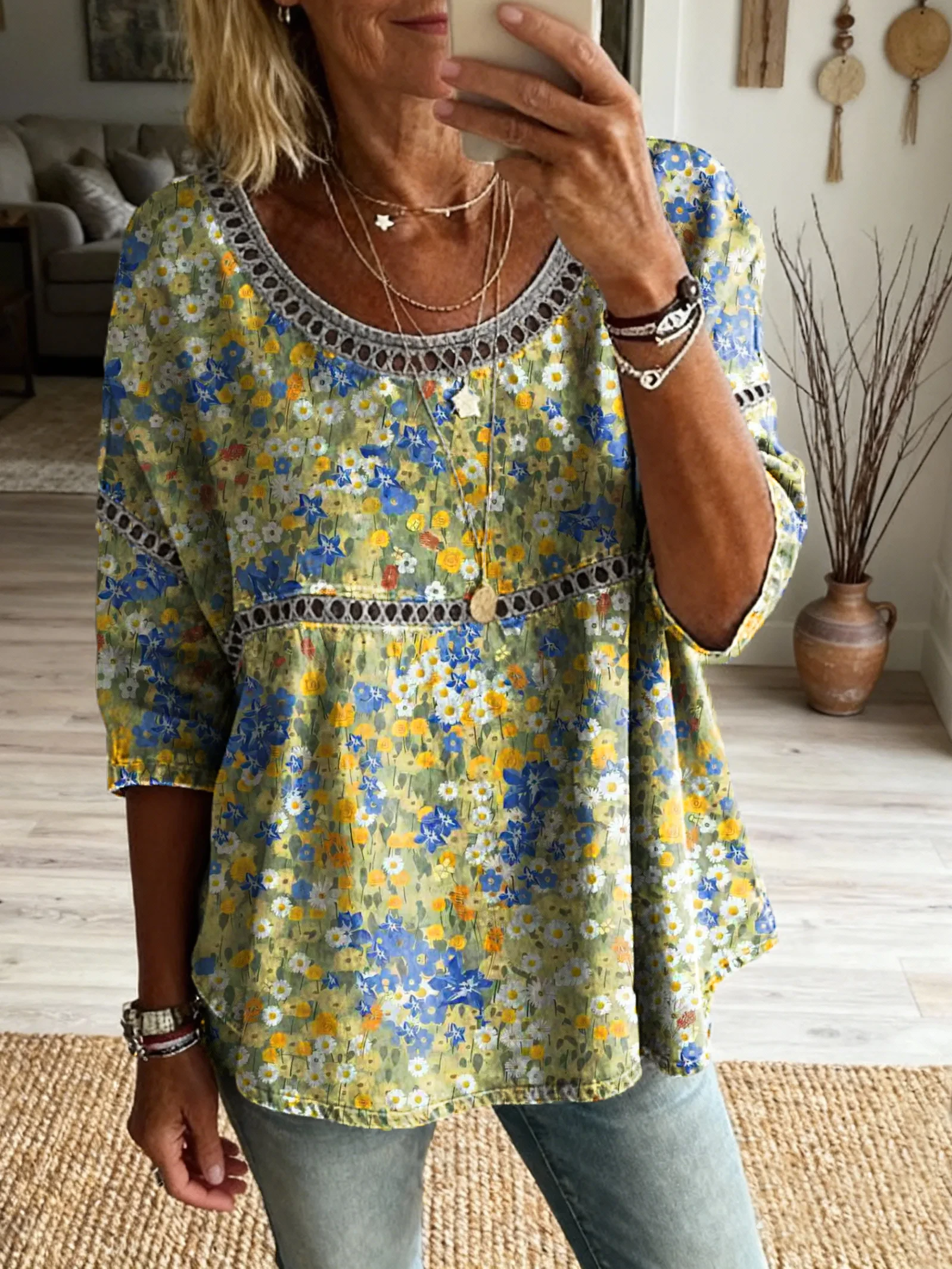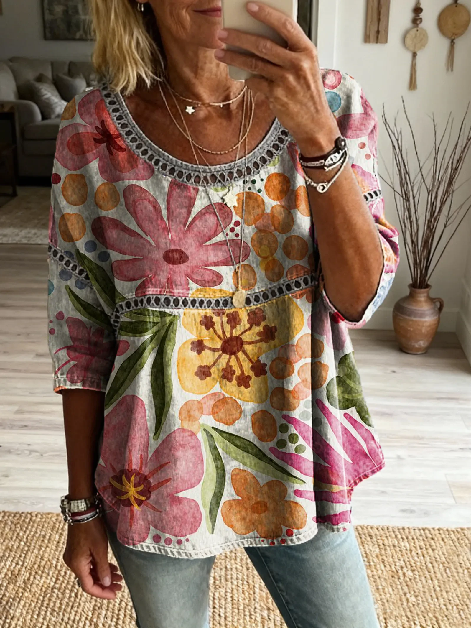 Women's Bohemian style floral pattern art print casual round neck cutout top
