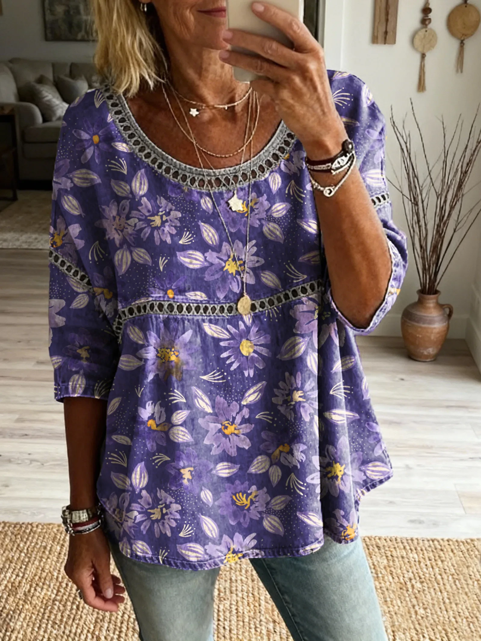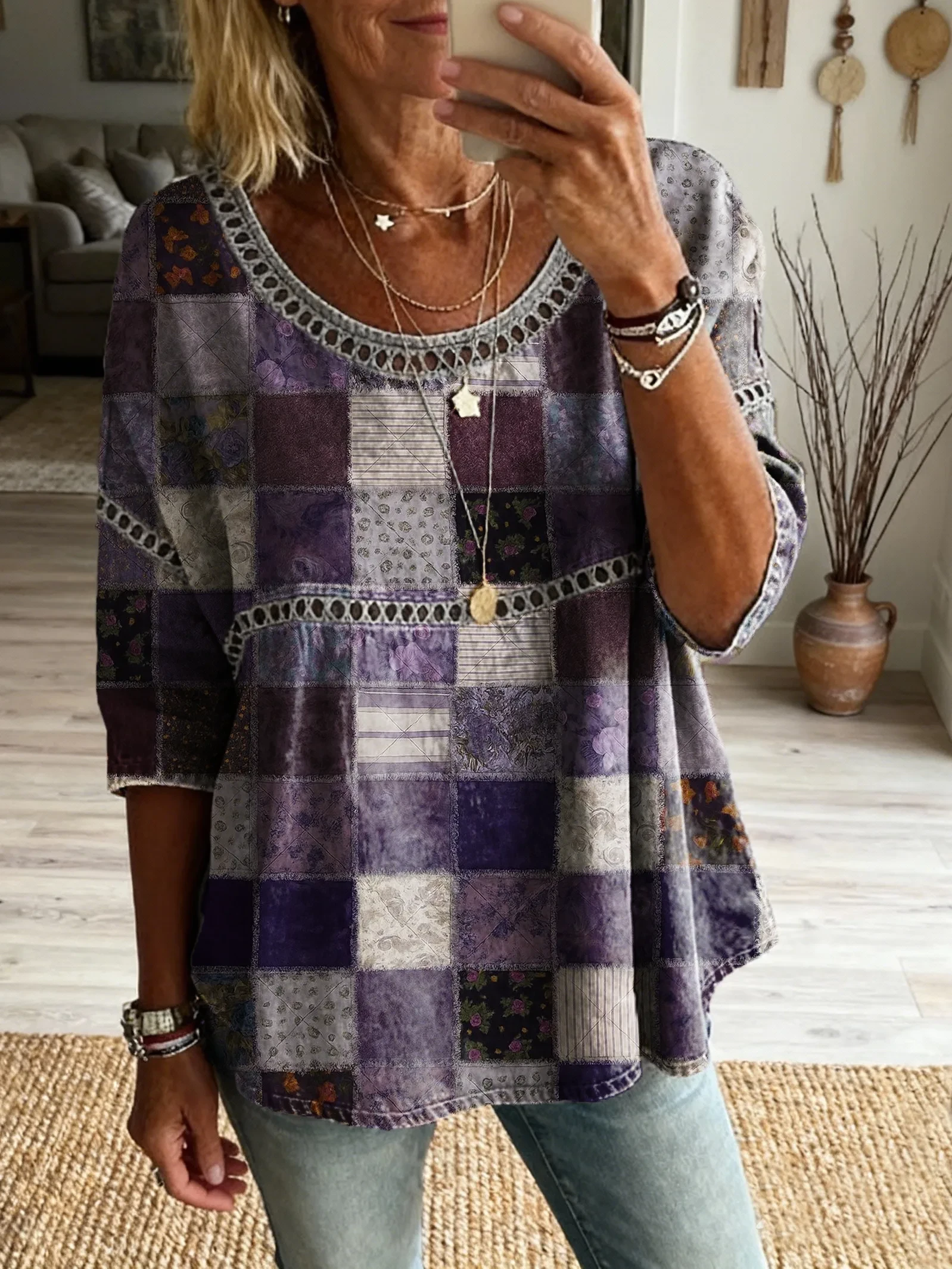 Ethnicity Patchwork Purple Flowers Women's Vintage Art Print Casual V Neck Cutout Top