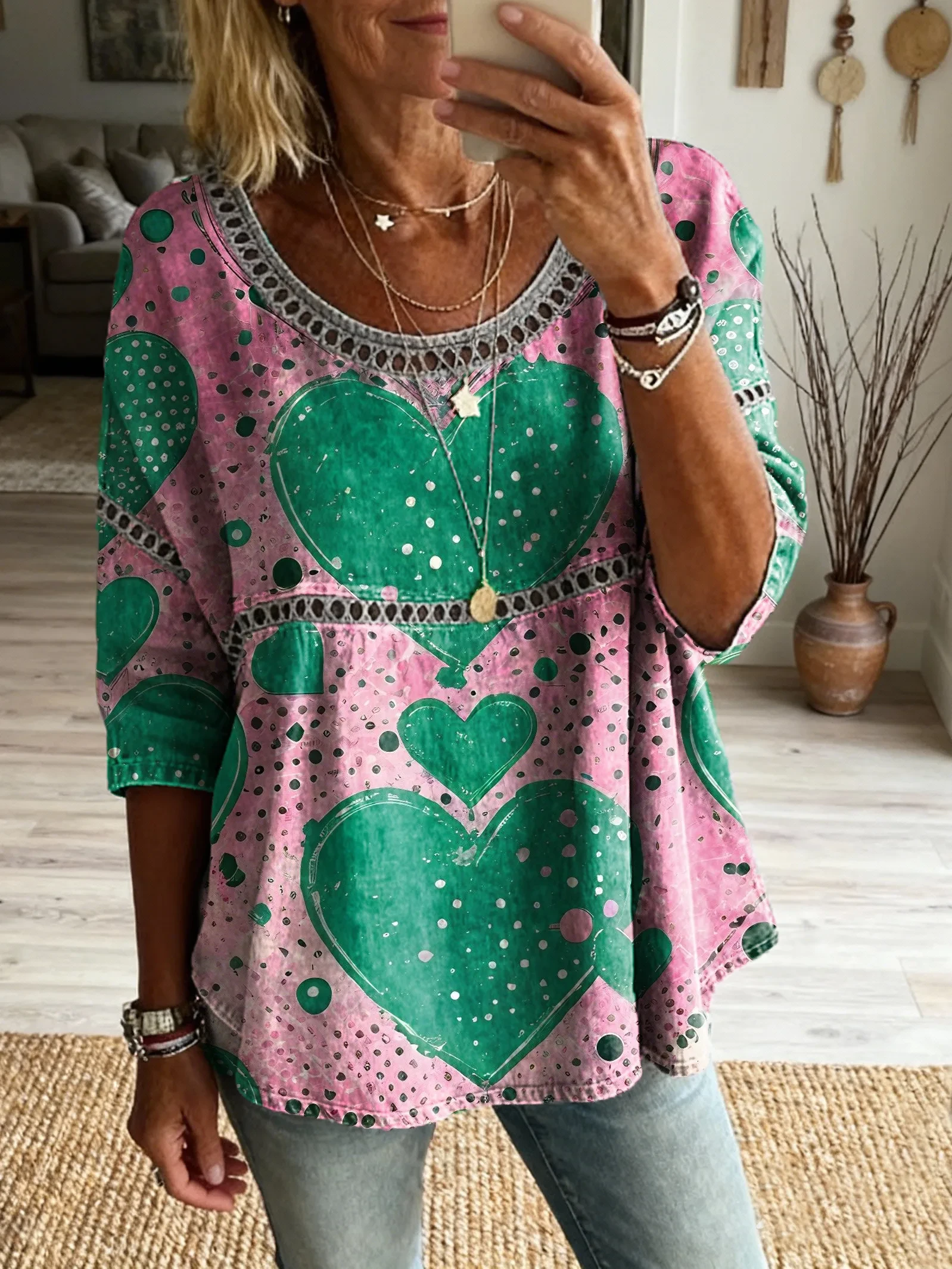 Women's Vintage Color Clash Heart Polka Dot Art Printed Casual Round Neck Cutout Cotton Top