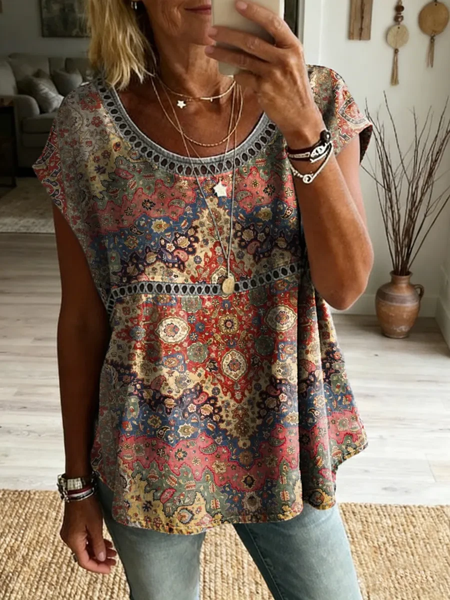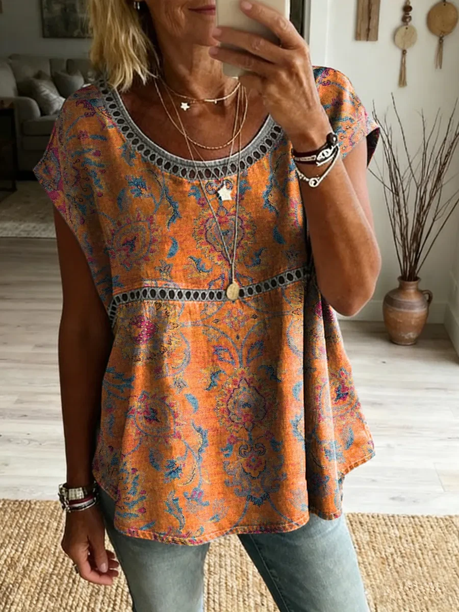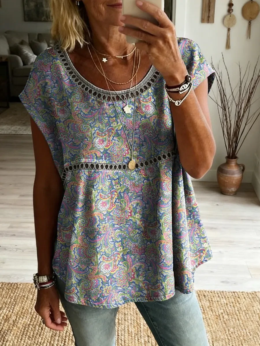 Ethnicity Flowers Paisley Women's Vintage Art Print Casual Round Neck Short-sleeved Cutout Top