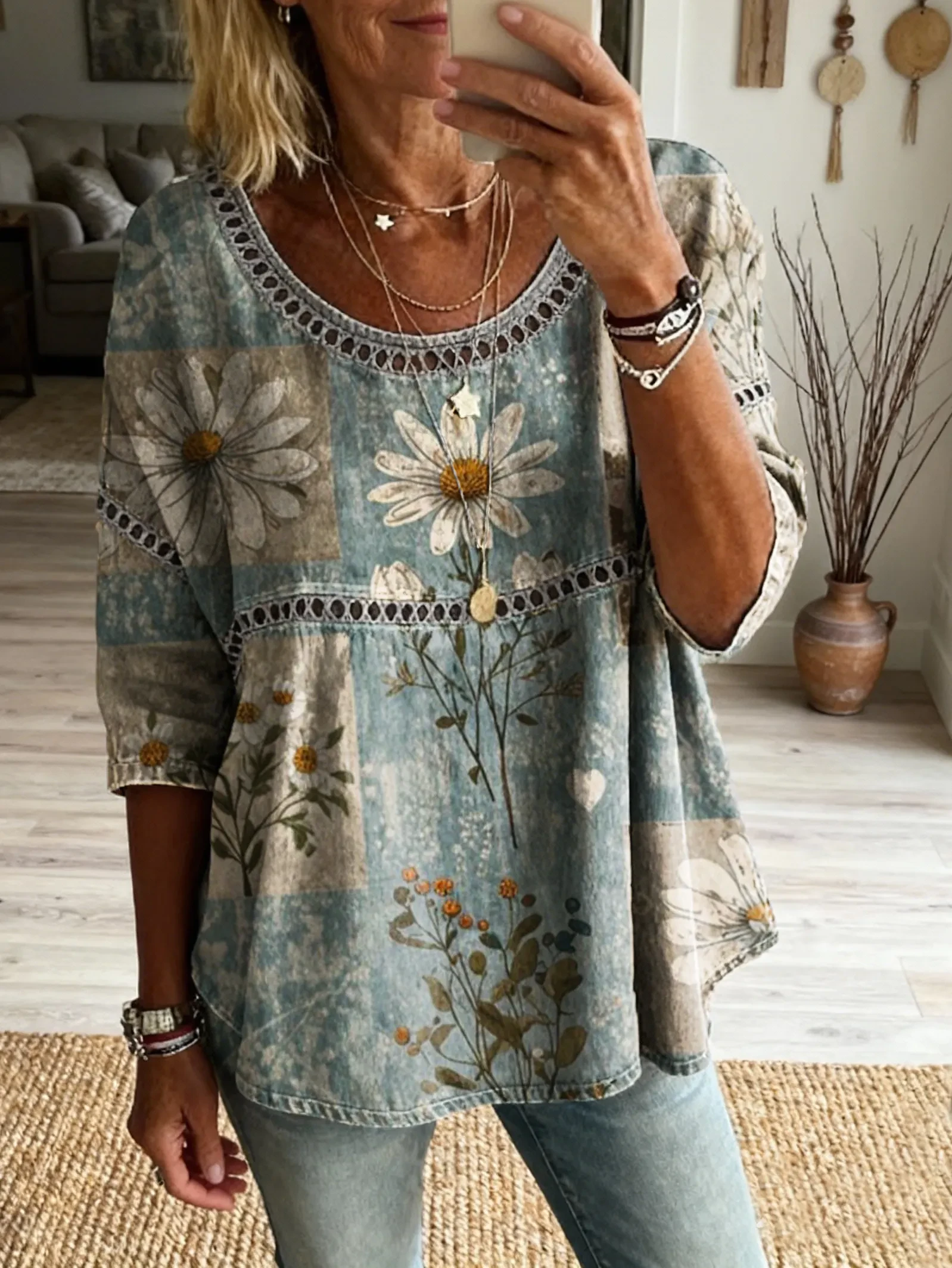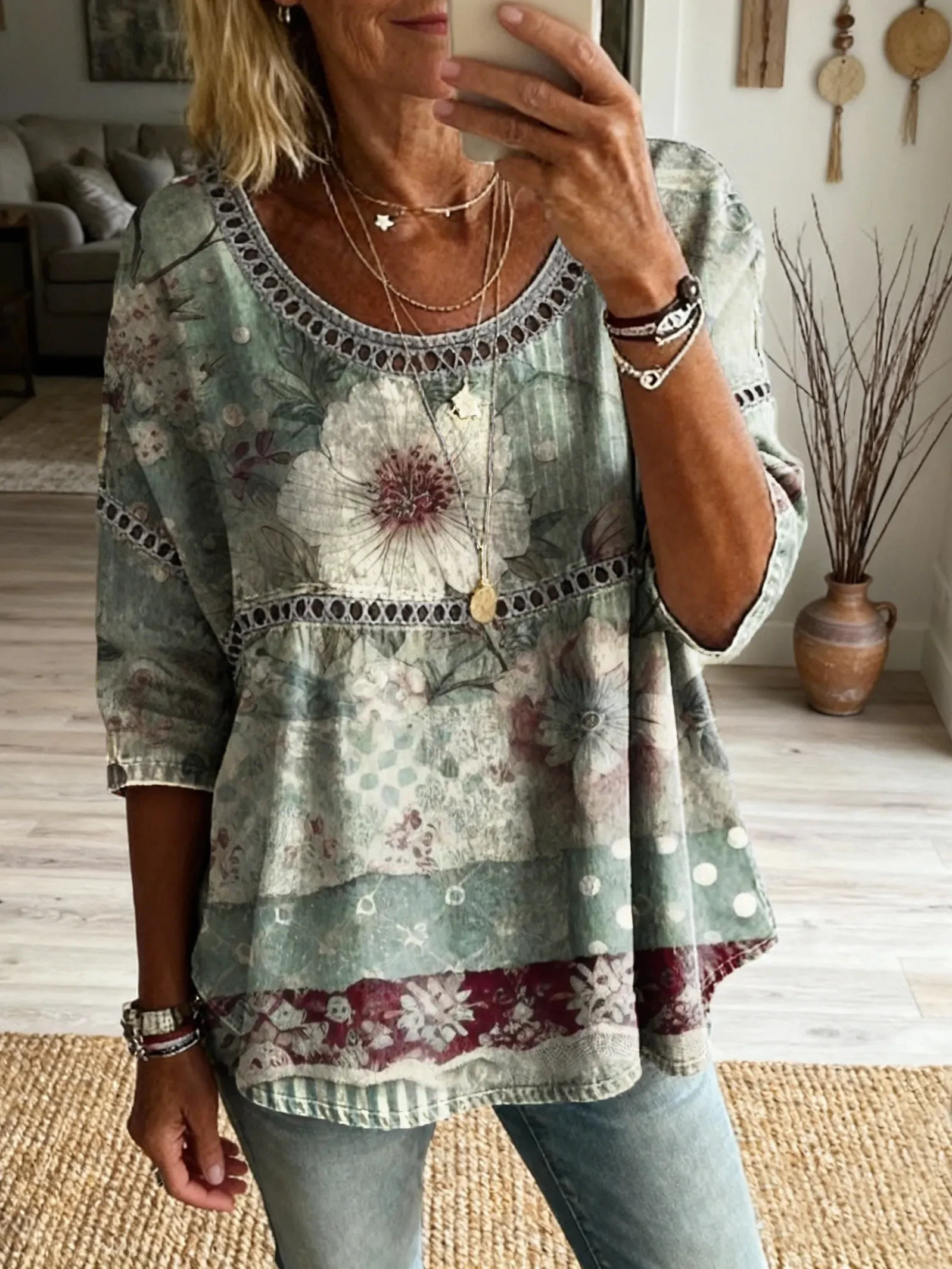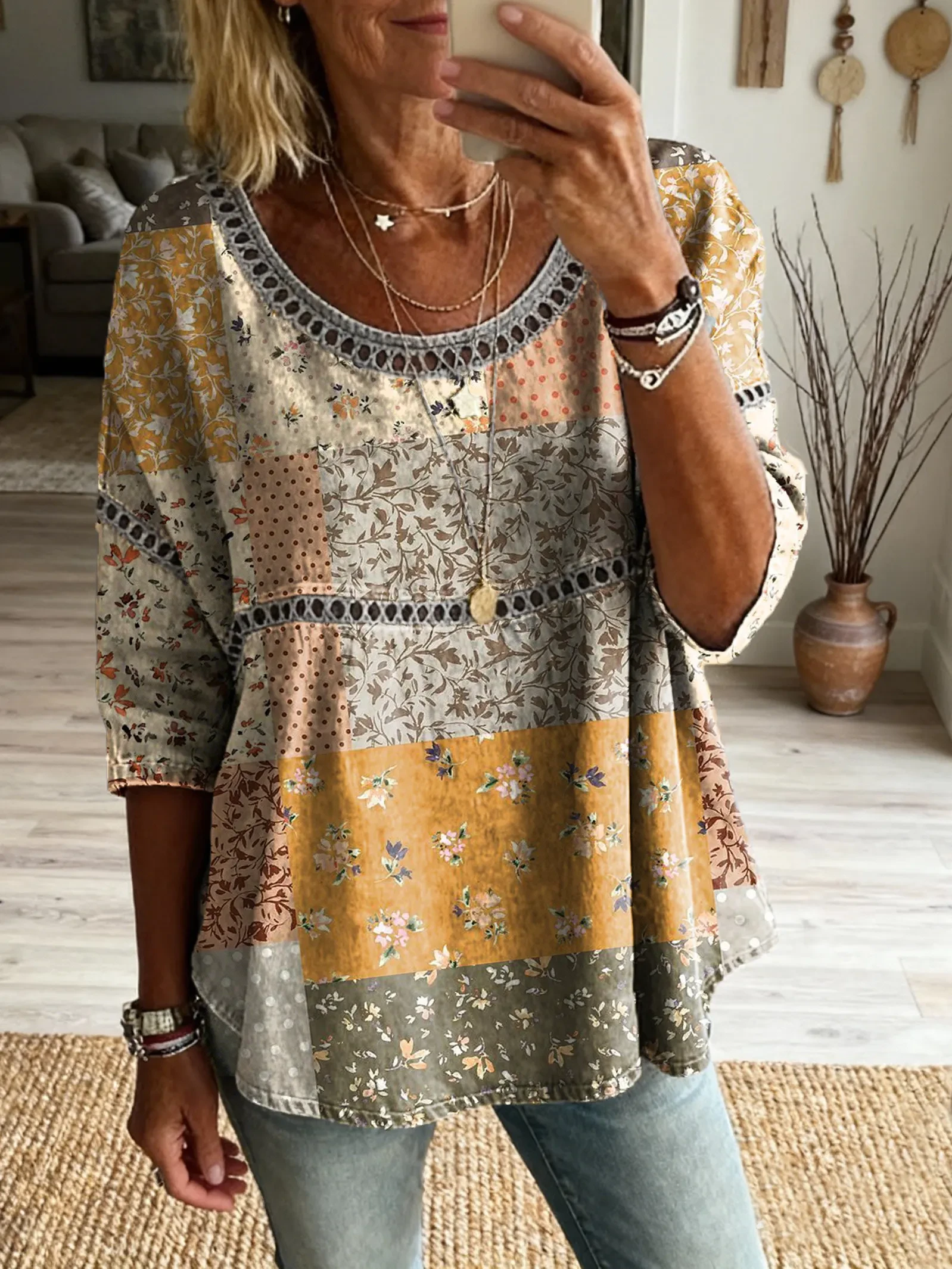 Ethnicity Bohemia Flowers Patchwork Women's Vintage Art Print Casual Round Neck Cutout Top