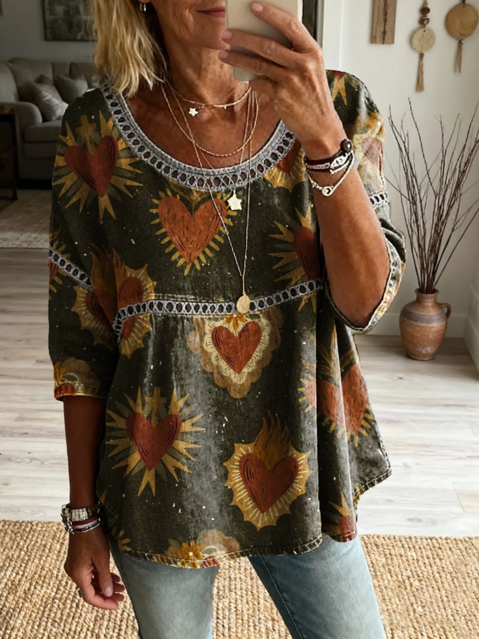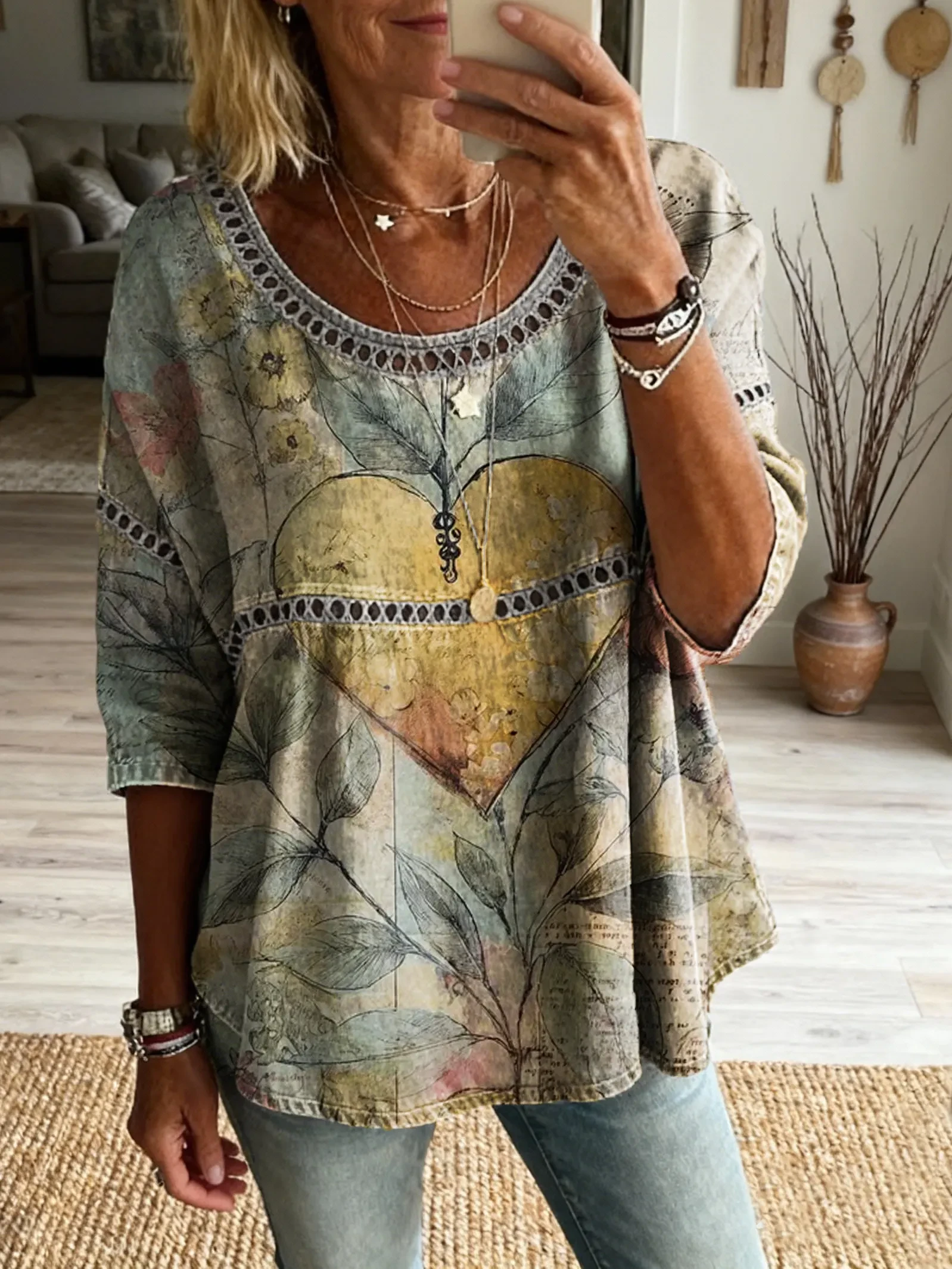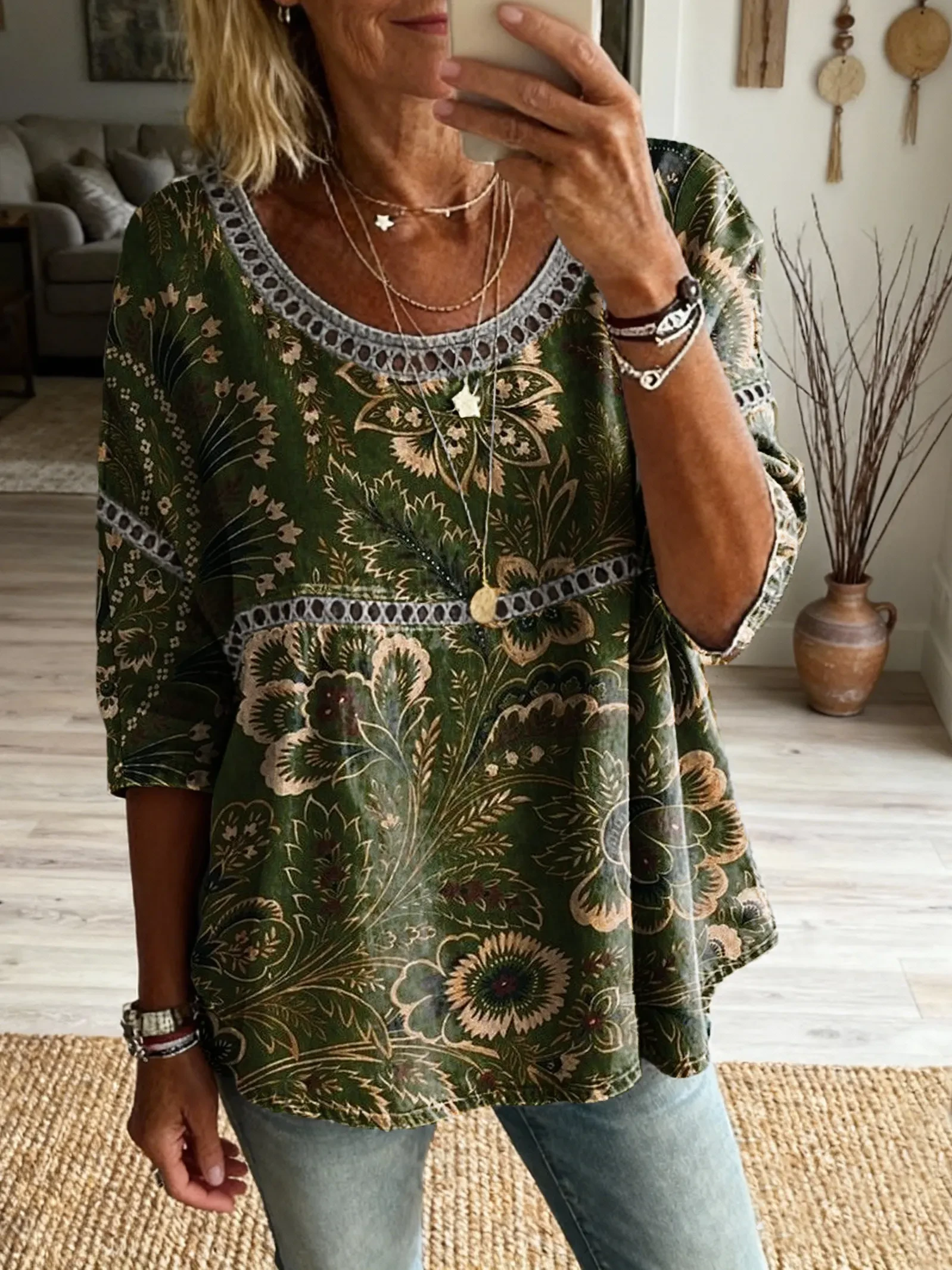 Ethnicity Bohemia Flowers Patchwork Women's Vintage Art Print Casual Round Neck Cutout Top