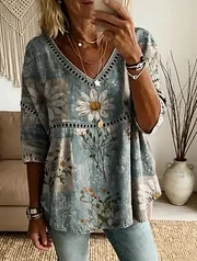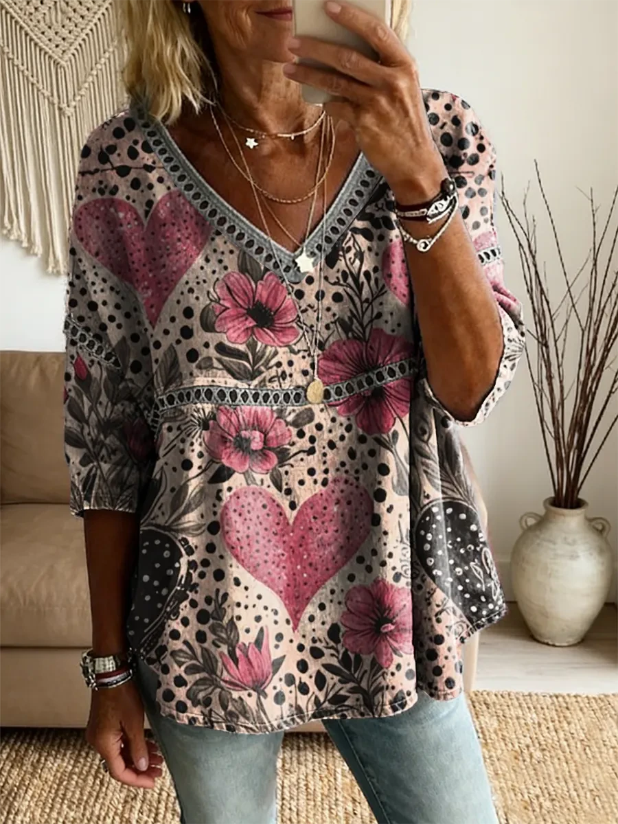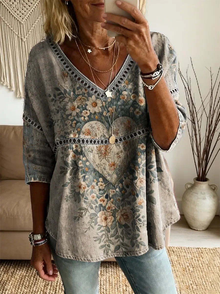 Ethnicity Bohemia Flowers Love Women's Vintage Art Print Casual V Neck Cutout Top
