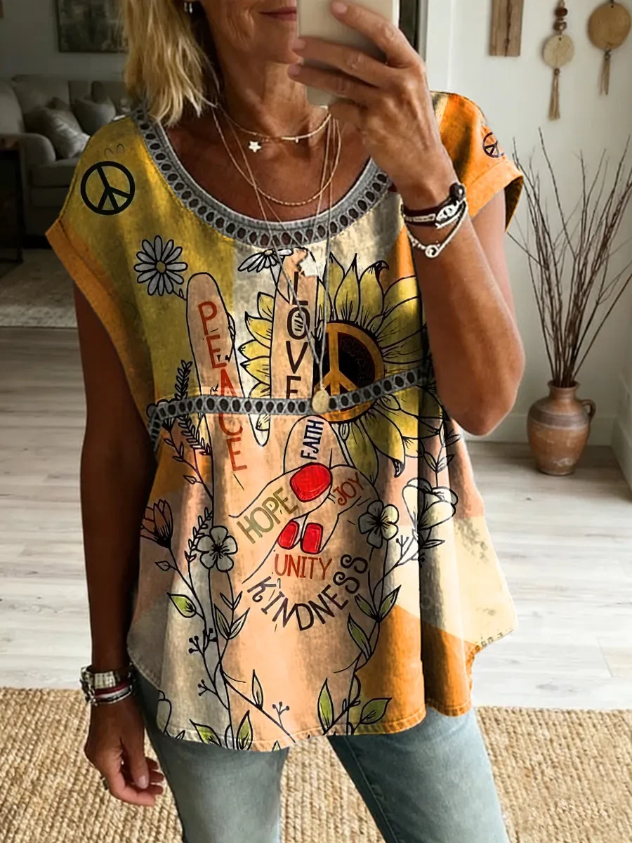 Hippie Peace Gesture Women's Vintage Art Print Casual Round Neck Short-sleeved Cutout Top