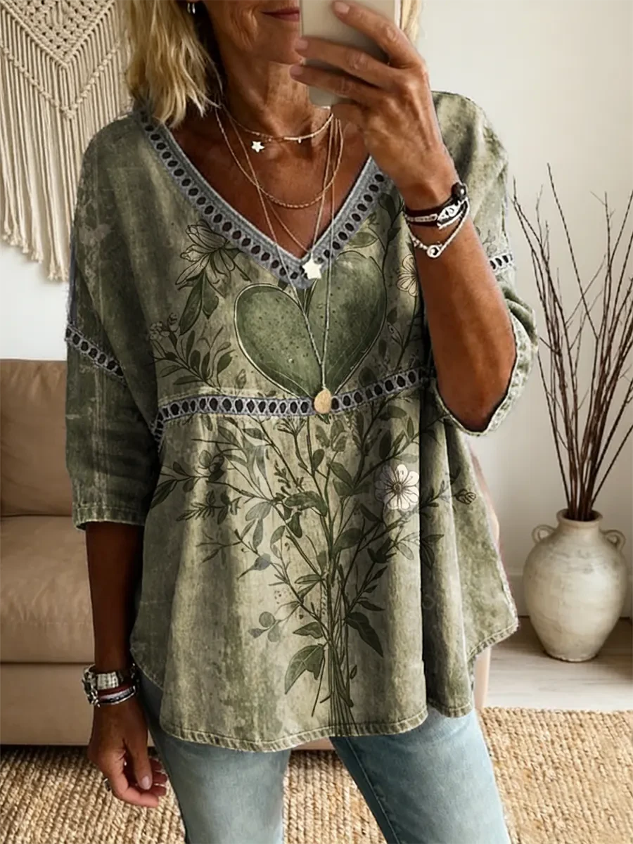 Ethnicity Bohemia Green Love Flowers Women's Vintage Art Print Casual V Neck Cutout Top