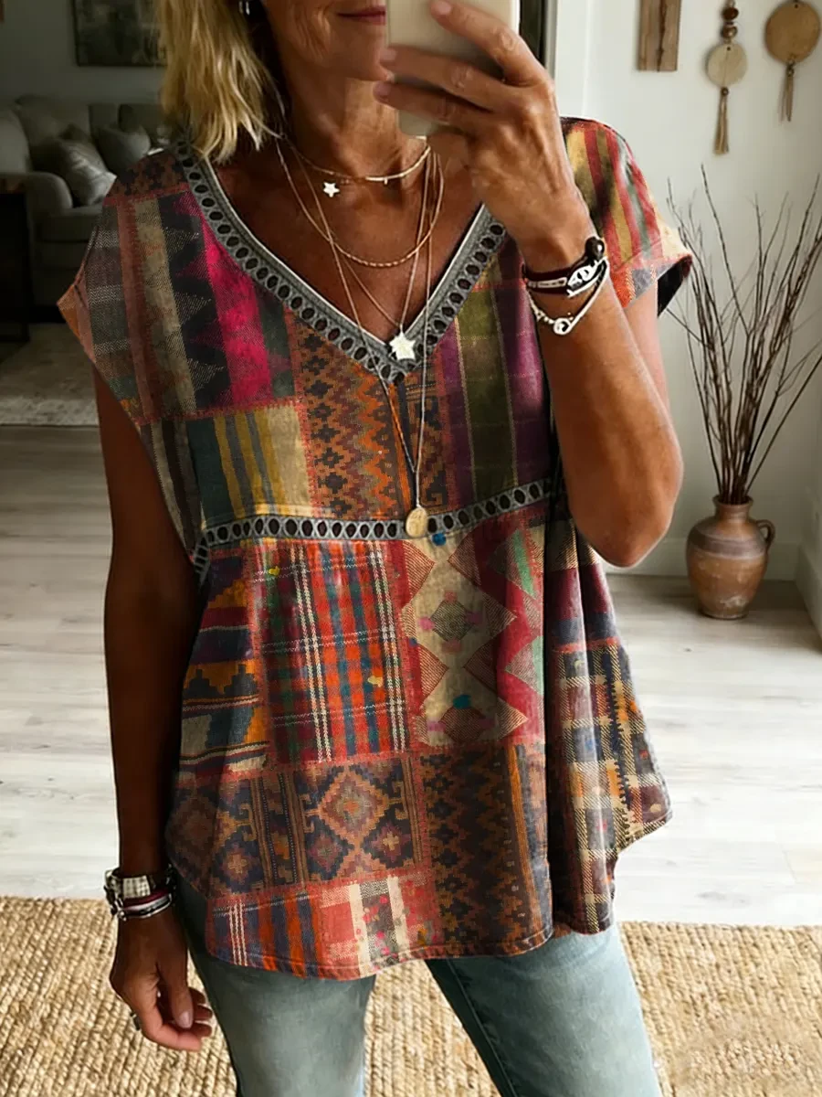 Ethnicity Totem Patchwork Women's Vintage Art Print Casual Short-sleeved V Neck Cutout Top