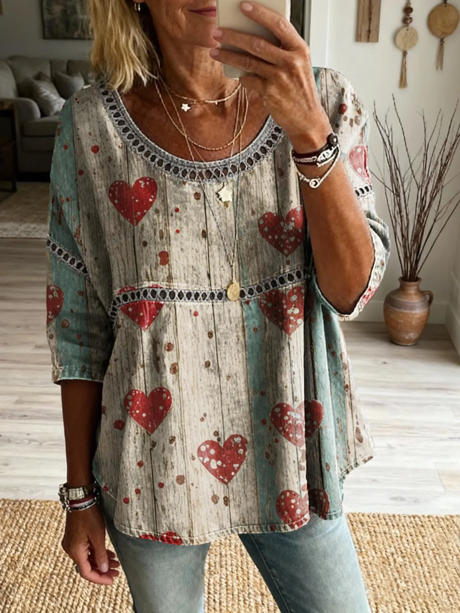 Ethnicity Bohemia Red Love Women's Vintage Art Print Casual Round Neck Cutout Top
