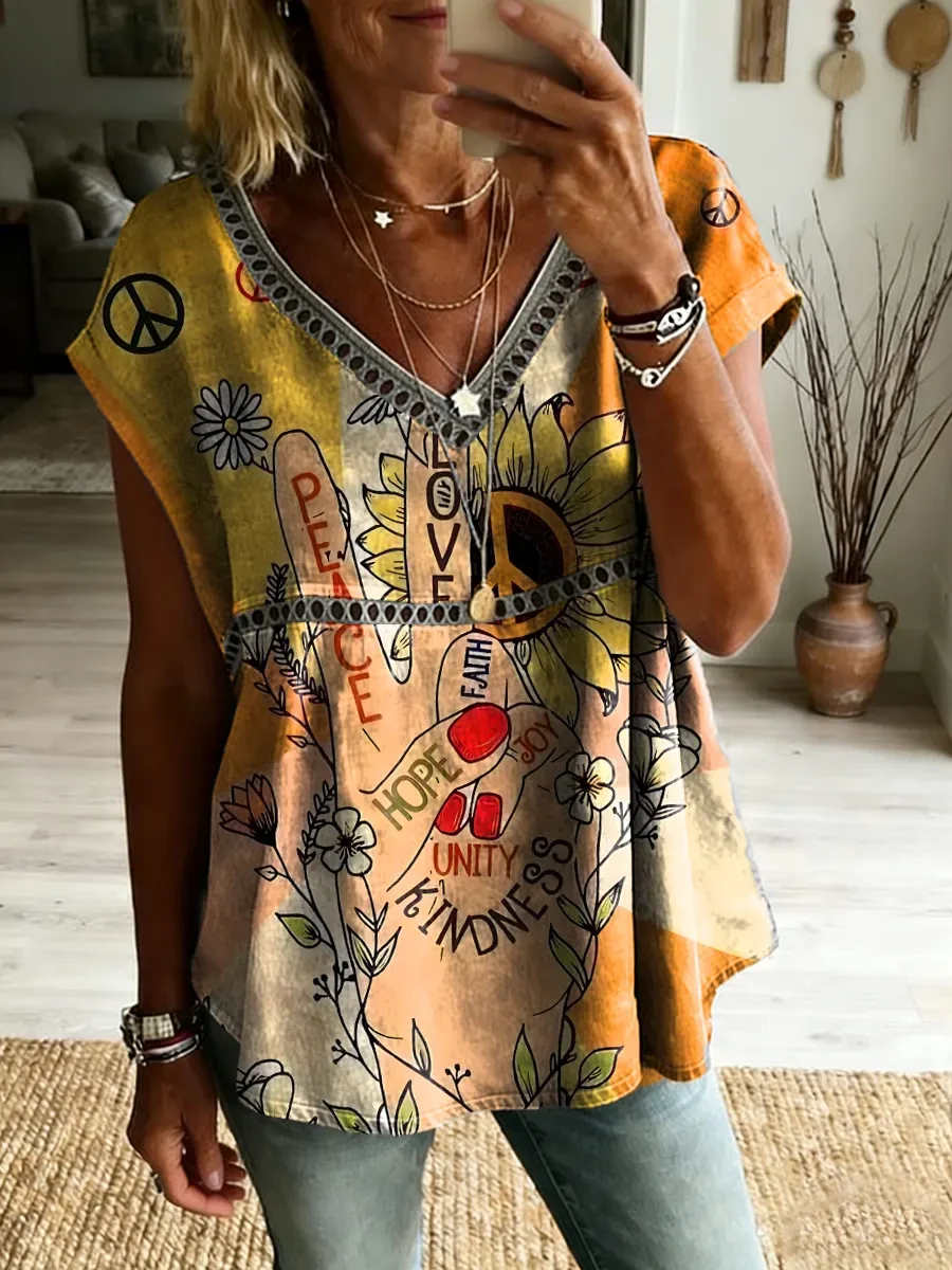 Hippie Peace Gesture Women's Vintage Art Print Casual Short-sleeved V Neck Cutout Top
