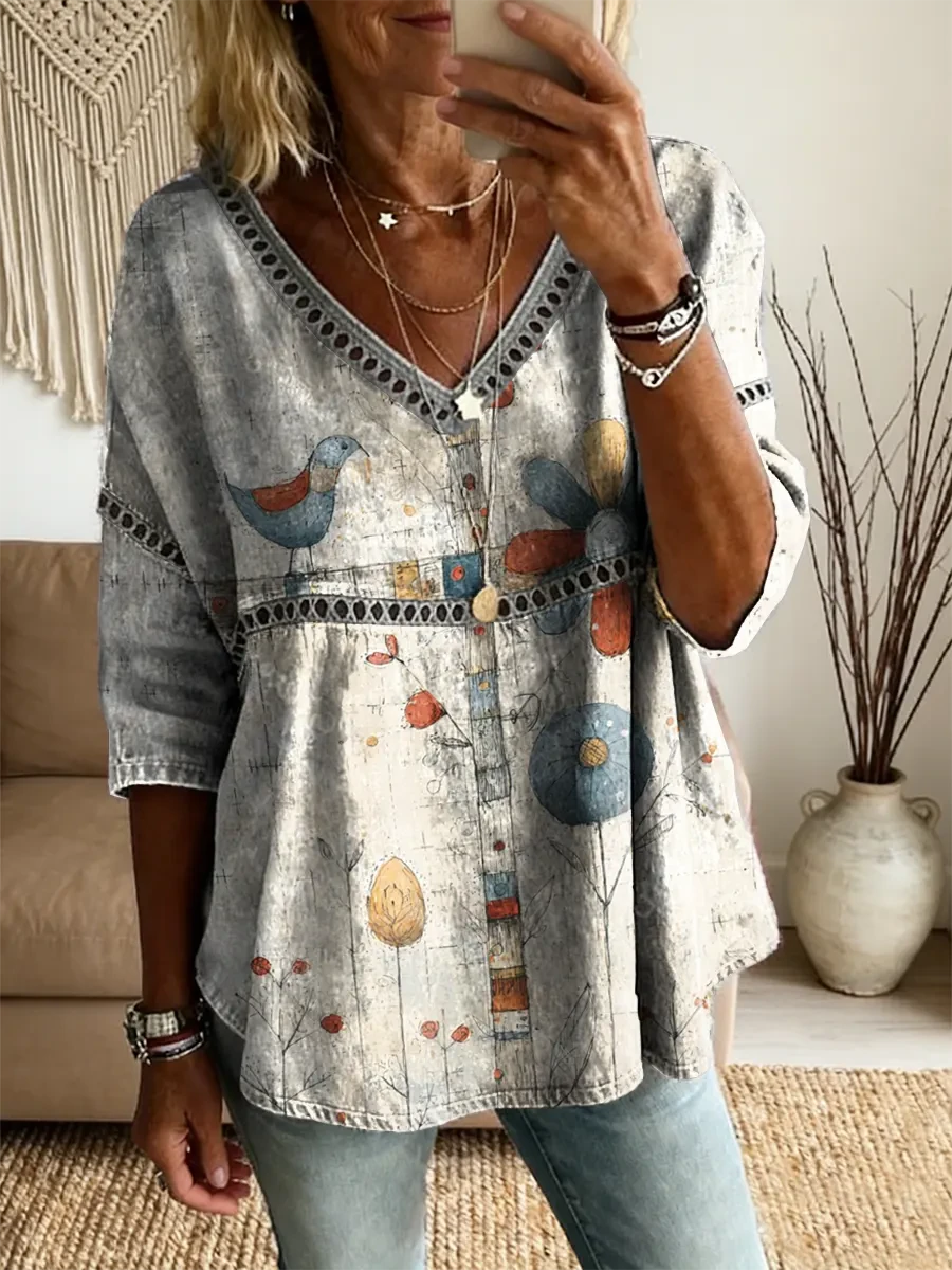 Ethnicity Bohemian Style Flowers Bird Women's Vintage Art Print Casual V Neck Cutout Top