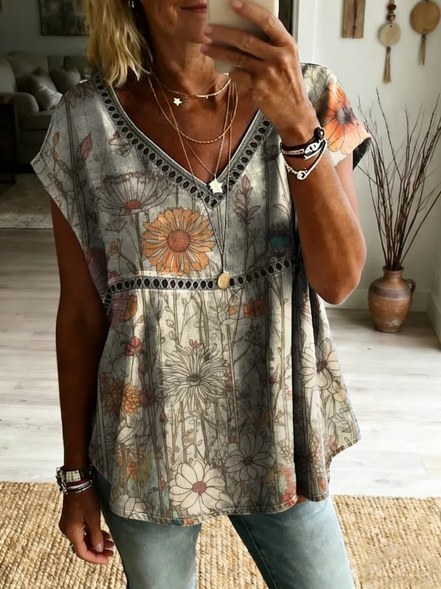 Ethnicity Flowers Bohemia Women's Vintage Art Print Casual Short-sleeved V Neck Cutout Top