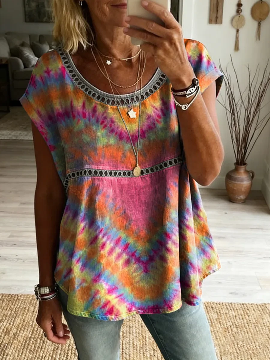 Ethnicity Tie Dye Love Women's Vintage Art Print Casual Round Neck Short-sleeved Cutout Top