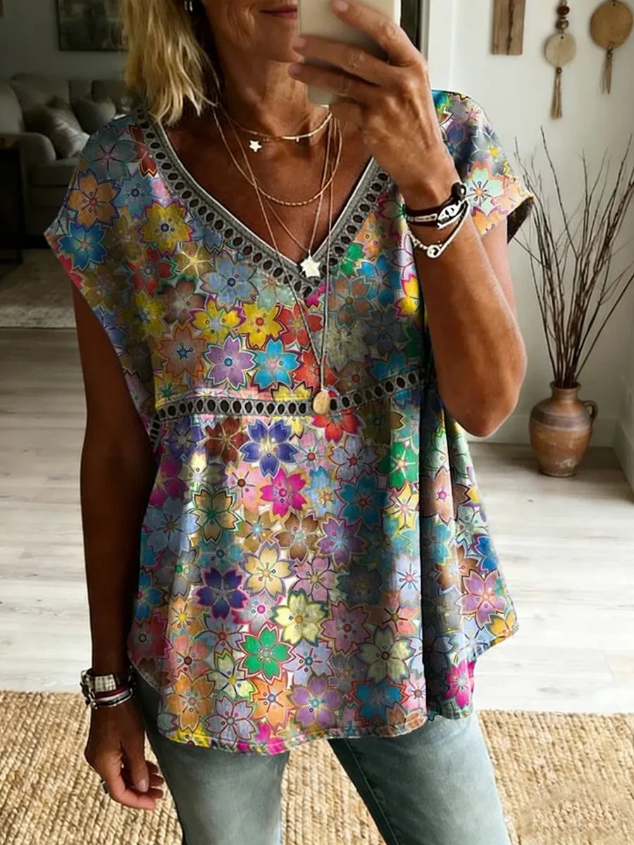 Ethnicity Colorful Flowers Women's Vintage Art Print Casual Short-sleeved V Neck Cutout Top