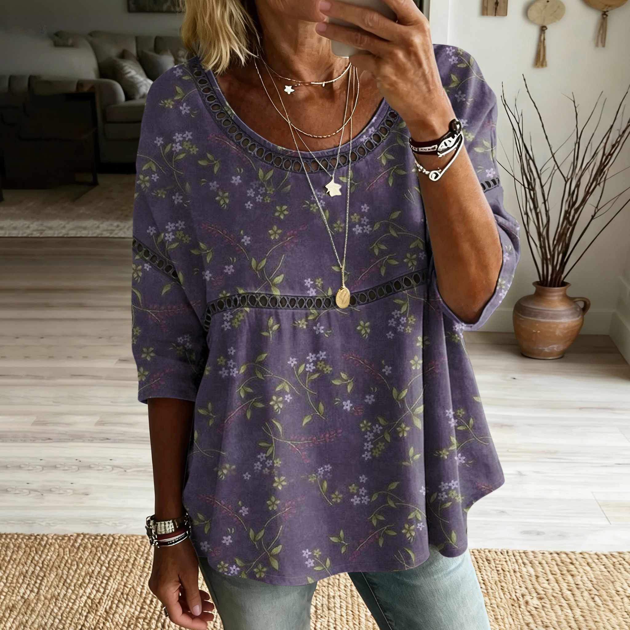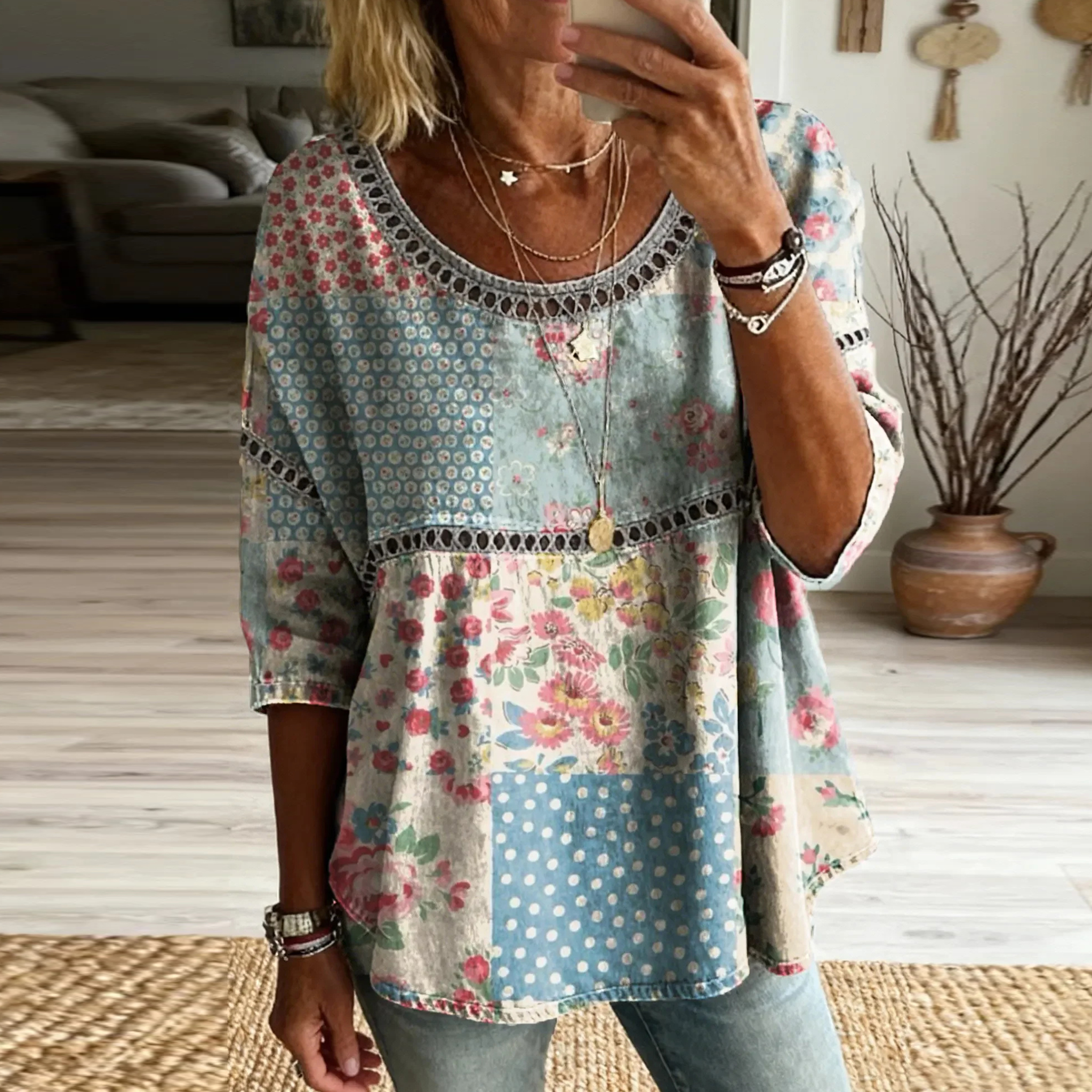 Women's Retro Floral In Patchwork Art Print Flowy Linen Blend Casual Tops