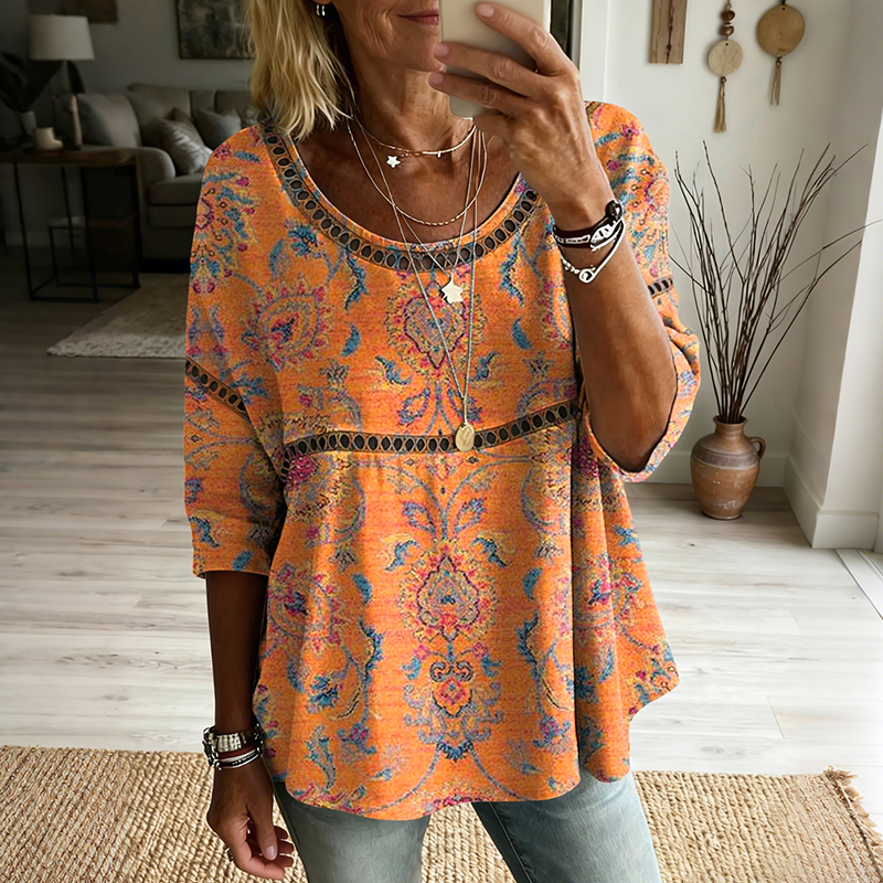Women's Vintage Ethnic Orange Floral Art Print Flowy Linen Blend Casual Tops